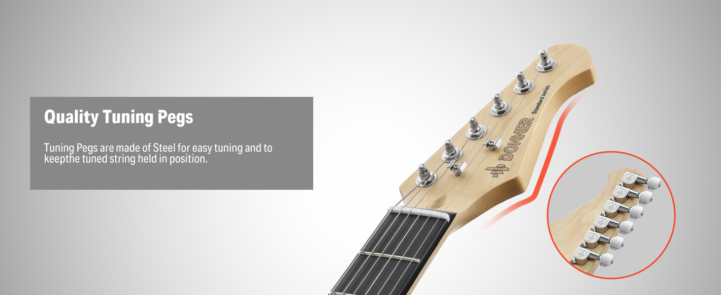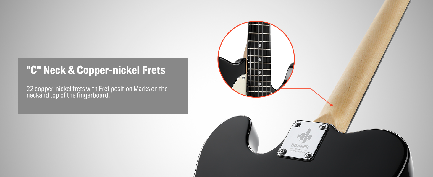 Klassisches und Komfortables Design – Die vollformatige E-Gitarre von Donner verwendet ein Halsprofil in „C“-Form und verfügt über 22 Bünde aus Kupfer-Nickel. Die Bundmarkierungen befinden sich auf dem Hals und an der Oberseite des Griffbretts. Sie kombiniert zwei klassische und bequeme Designs und ist auch für Anfänger geeignet.