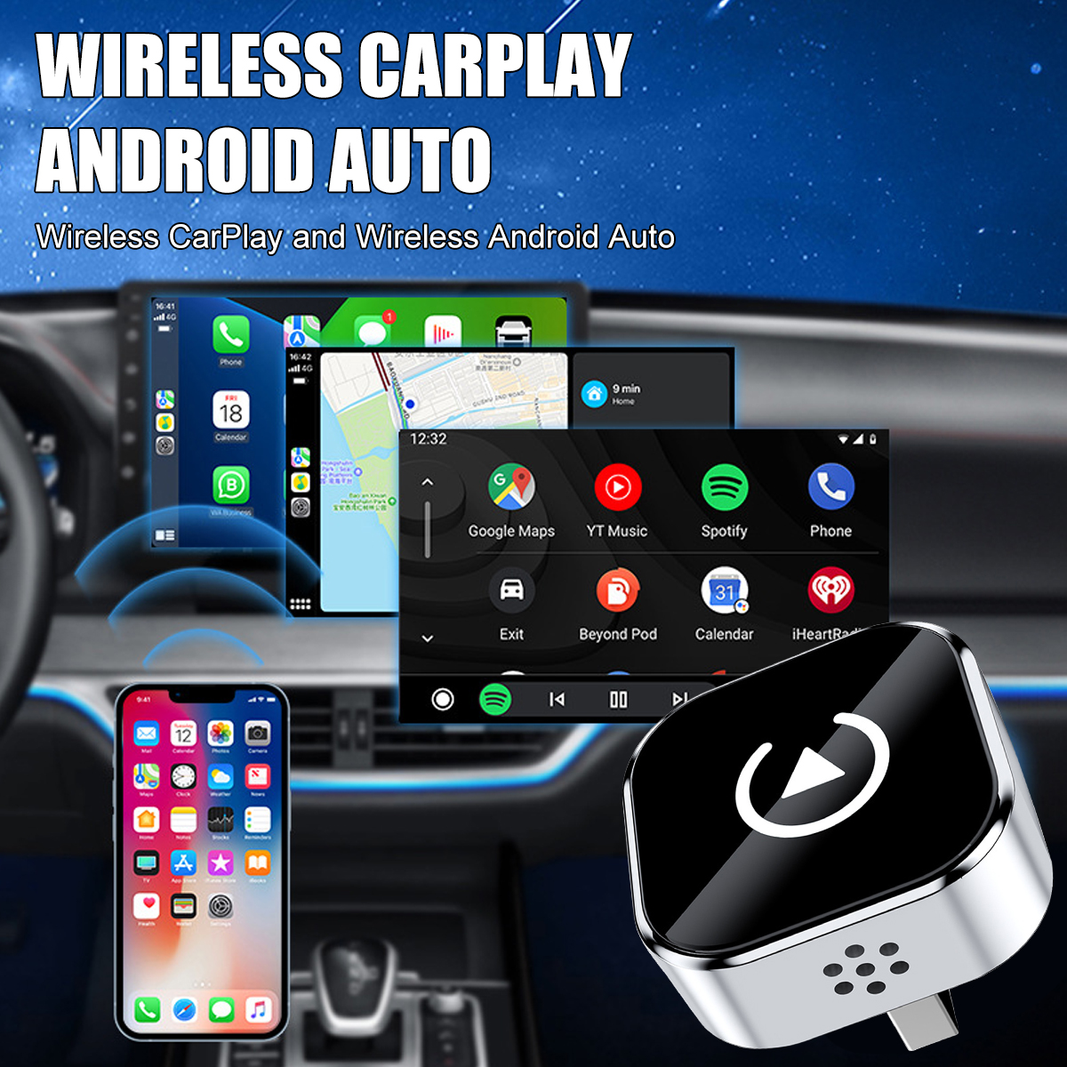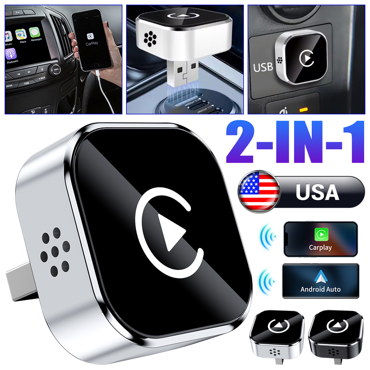 Features:2 in 1 Wireless CarPlay Adapter: Upgrade your wired system to wireless in seconds. Enjoy seamless navigation, Spotify/Apple Music streaming, hands-free calls, and voice commands for a safer drive and tidy dashboard with our ai box.