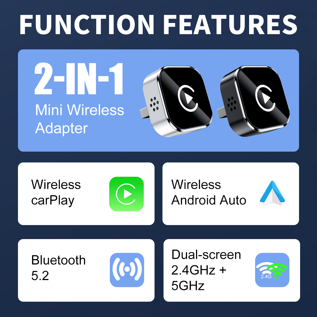 Dual-Band Superior Performance: With 2.4GHz + 5GHz dual-band chipset, our wireless adapter boosts performance by 100%, delivering fast, smooth CarPlay experience for seamless music streaming, navigation, and hands-free calling.