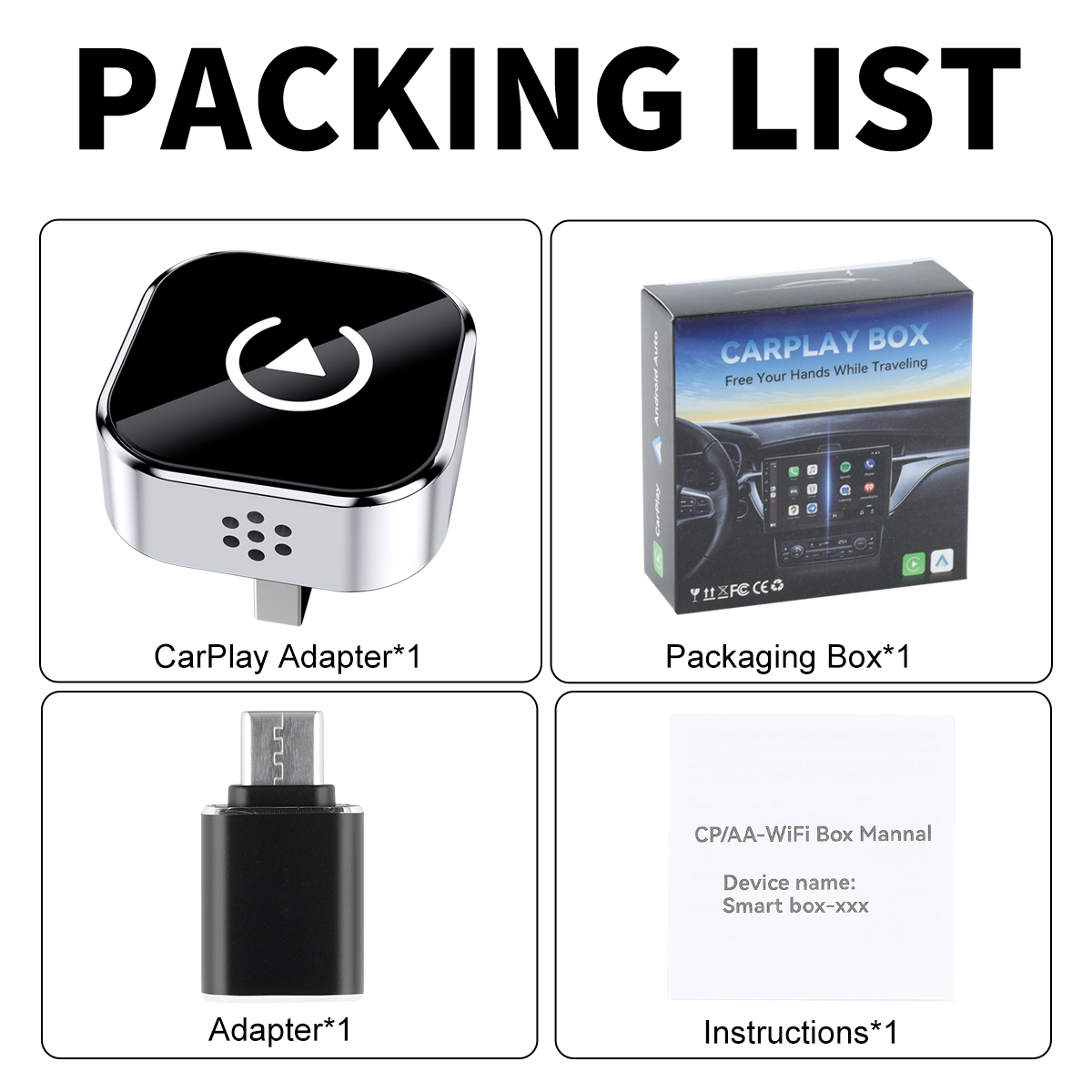 Packing list: Wireless carplay box*1, instruction manual*1, type-c data cable*1