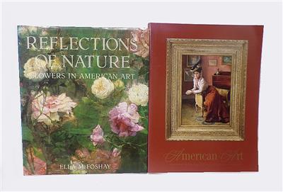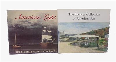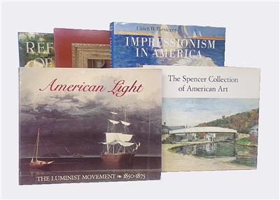 A lot of 5 books on American art, mostly 19th century. Included are: Impressionism In America, The Ten American Painters, by Ulrich W. Hiesinger, published by the Jordan-Volpe Gallery, New York, in association with Prestel, 4to, cloth-covered boards with dust jacket. Fine condition; Reflections of Nature, Flowers in American Art, by Ella M. Foshay, published by Knopf, New York, in 1984. 4to, cloth-covered boards with dust jacket retaining the price statement. Near fine condition, with name inked on the first blank; American Light, The Luminist Movement 1850-1875, Paintings, Drawings, Photographs, by John Wilmerding. Published by the National Gallery of Art, Washington D. C., in 1980. 8vo, Oblong paperback. Interior fine. Covers show signs of age and use, including a vertical fold on the front panel; The Spencer Collection of American Art, published by the Spanierman Gallery, New York, in 1990. Oblong, 8vo paperback. Fine condition. American Art From the Dicke Collection, An Exhibition Organized by the Dayton Art Institute, curated by Todd D. Smith, with essays by James F. Dicke II et at. 4to paperback. Near-fine condition, marred only by light creases in the outside bottom corners of the covers.
