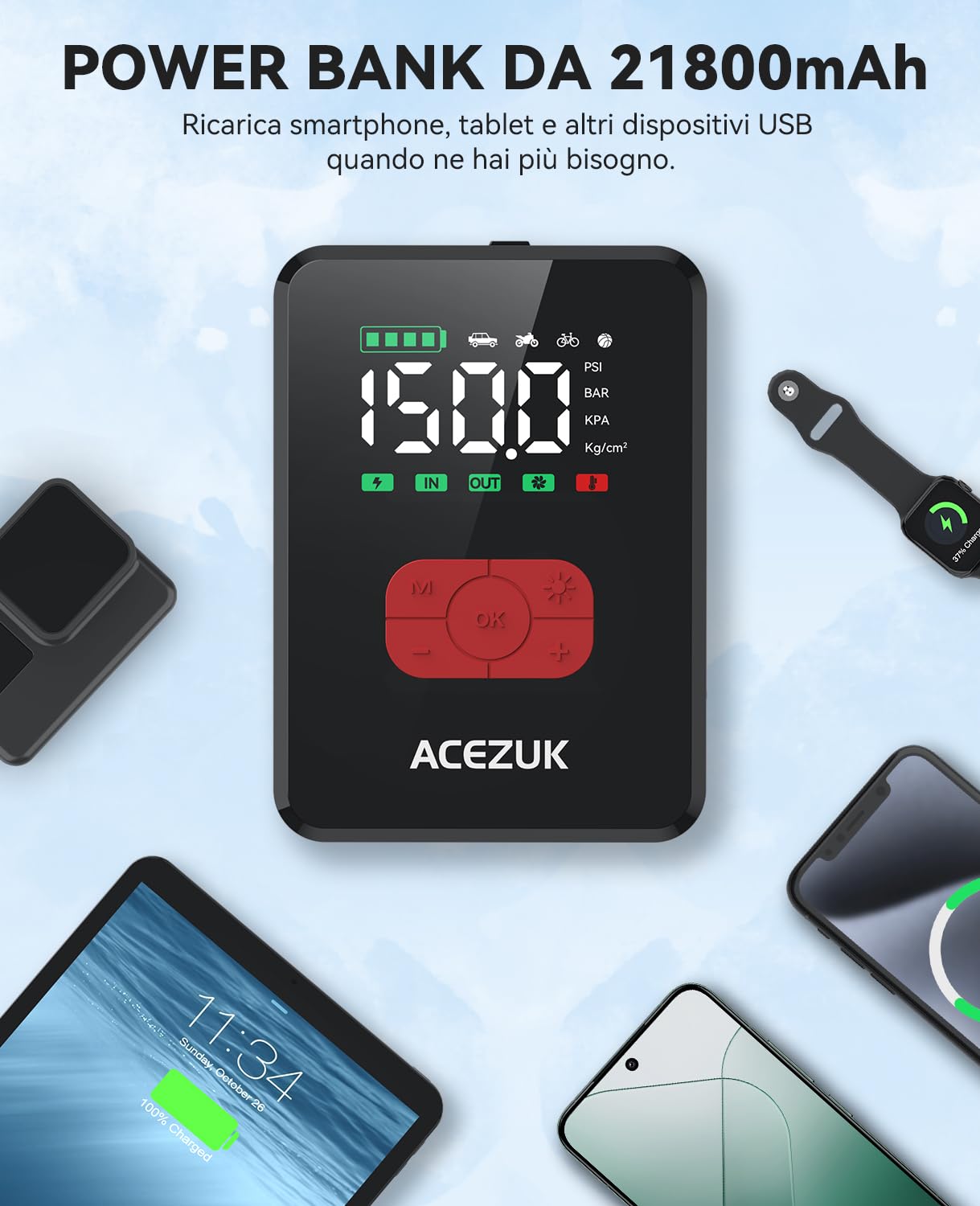 ➤ 【150PSI Gonfiaggio Ultrarapido 】è dotato anche di un compressore d'aria da 150 PSI e di quattro ugelli, appositamente progettati per il gonfiaggio rapido di pneumatici per auto, moto, attrezzature sportive, ecc. Bastano solo 60 secondi per gonfiare uno pneumatico da moto da 0 BAR a 2,5 BAR (da 0 a 36 PSI); bastano solo 21 secondi per gonfiare un pallone da 0 BAR a 0,55 BAR (da 0 a 8 PSI);Facile da usare, preimpostazioni intelligenti, rilevamento della pressione e autospegnimento