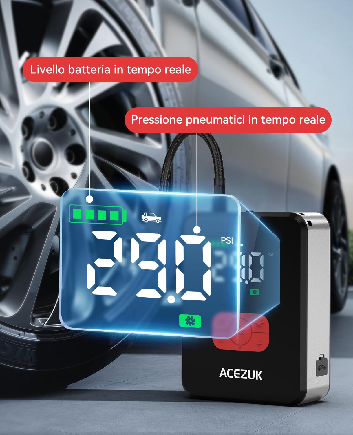 ➤ 【3.4"" LCD Digital Pressure Gauge & Auto Stop】 ACEZUK M06 auto tire inflator comes with LED real time digital pressure gauge screen, easy for accurate readings. You just need to choose the modes(car, bike, motorcycle, ball, customized modes) with your desired preset pressure, connect the tires with hoses, then press the power button to start inflating your tires. This tire inflator portable air compressor will auto shutoff when the desired PSI is met.