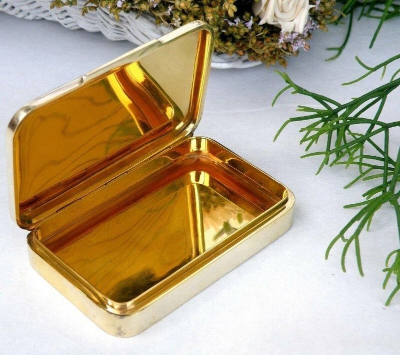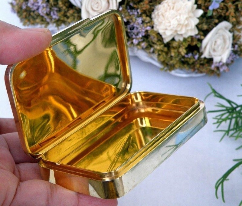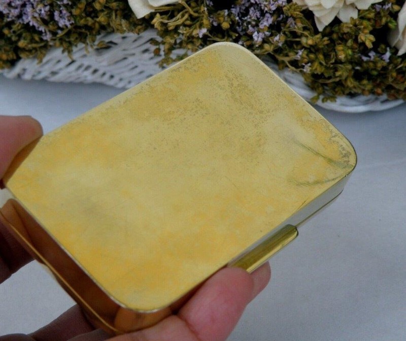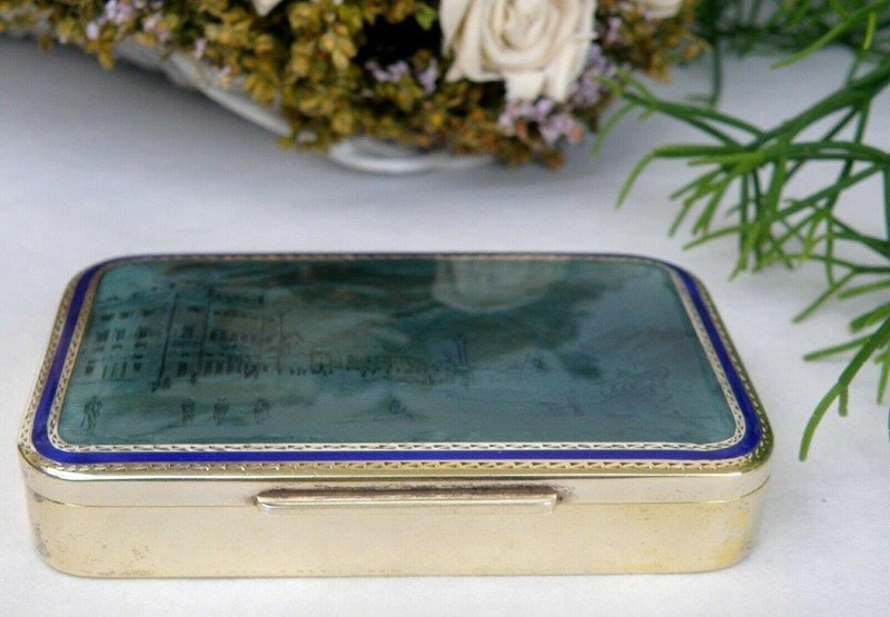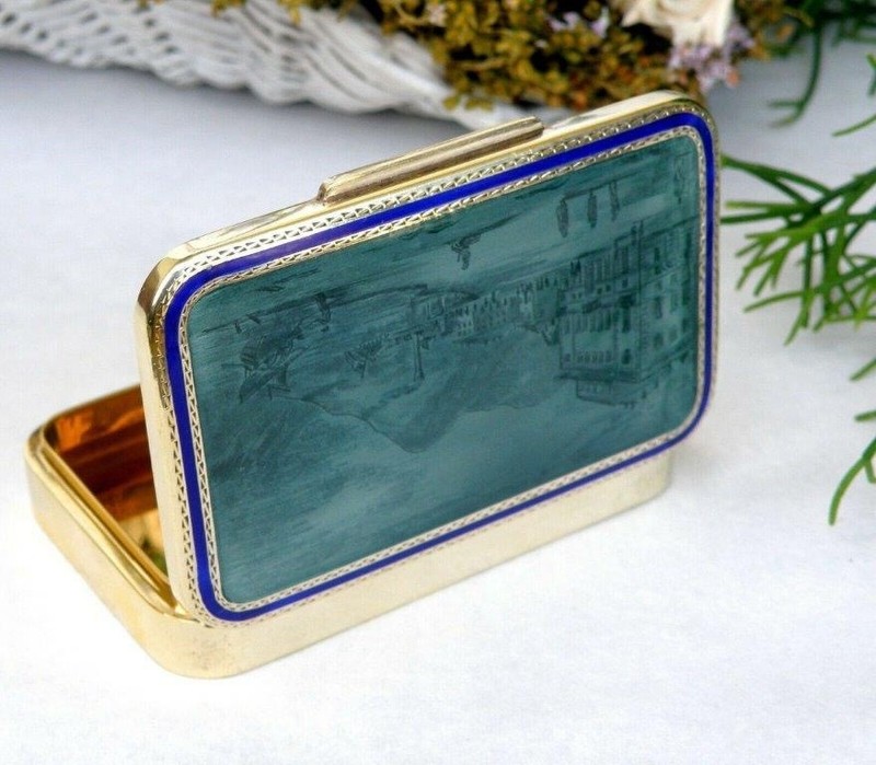 9.1 cm L x 6 cm W x 1.7 cm H Weight: 156 grms / 5.5 OZ Hallmark: 381 FI AG, FIRENCE, Italy, 925 On the lid, stunning enamel decor of a town on the edge of a lake with large buildings and several figures with a large fireplace and mountains in the background. This decor is surrounded by a fine and beautiful dark blue border. Splendid interior in a very beautiful gold color In excellent condition |