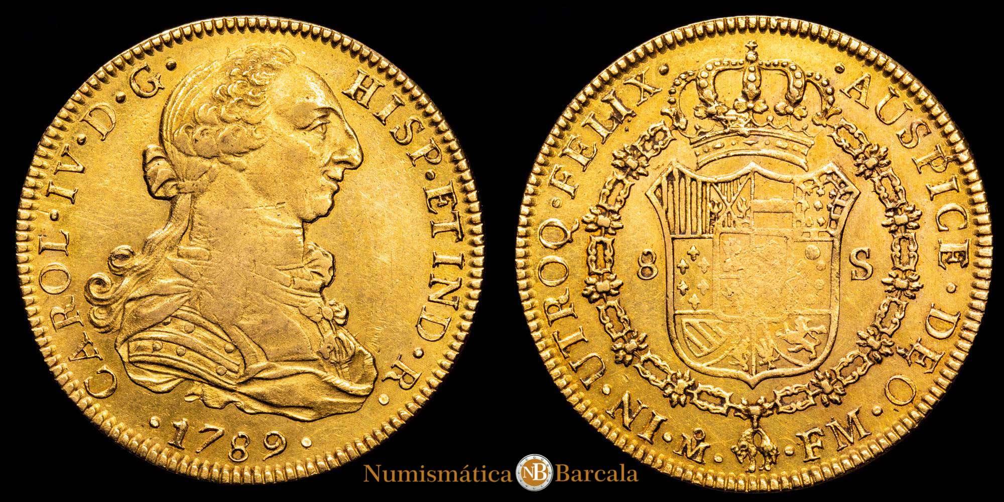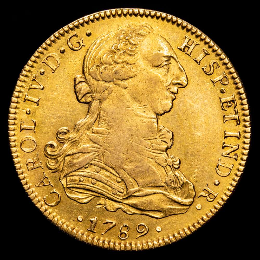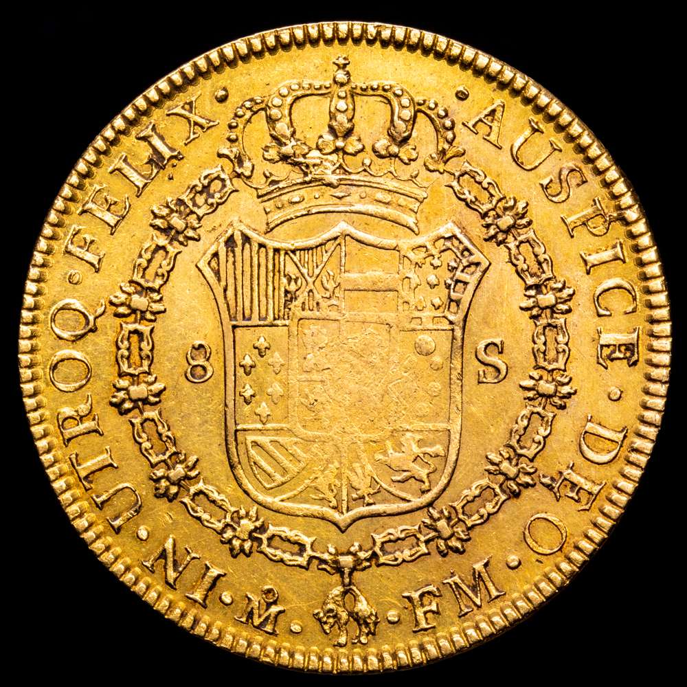Carlos IV. México. FM. 8 escudos. 1789. (AC. 1627) (Cal.Onza 1015). Busto de Carlos III. Ordinal IV. Acuñación algo floja. Escasa. 27,06 g. Brillo original, totalmente presente en el reverso. MBC+ o algo mejor. Escasa.