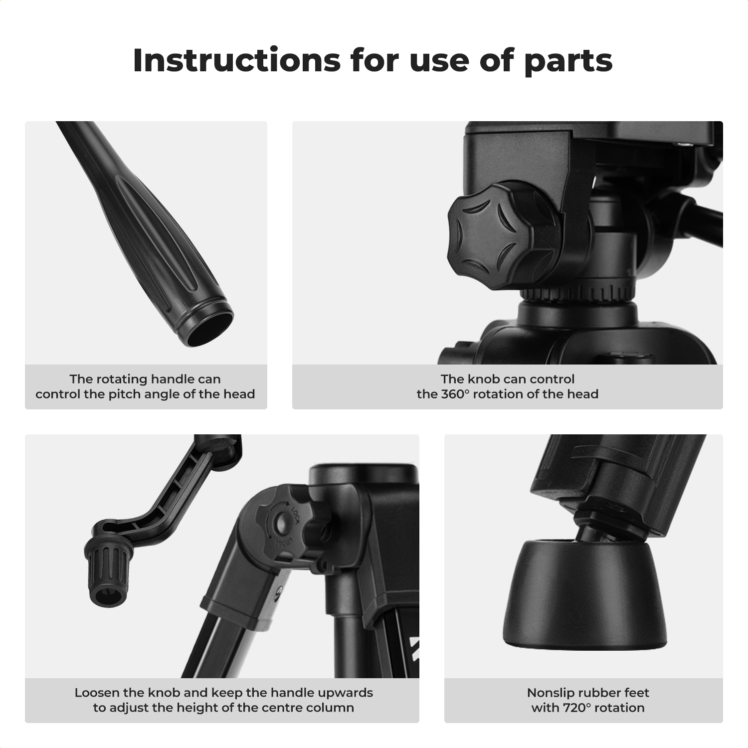 The 3-way pan-tilt head enables 360° panoramic rotation, ±90° tilt, and portrait/landscape switching, supporting overhead shots, low-angle filming, and creative framing.