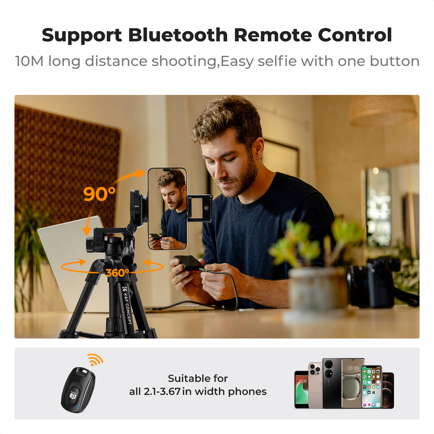 Includes a phone/tablet clamp, Bluetooth remote (10m range), and carrying case. The ¼" screw mount is compatible with cameras, phones, conference webcams, and more.