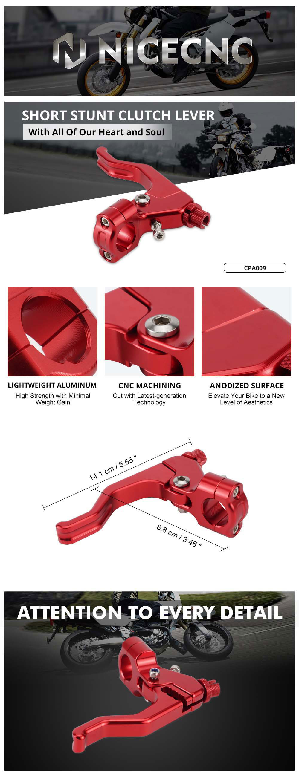 | Welcome ![]() Product Description Product Details: -- Condition:100% Brand New -- Color: Red -- CNC Machined from High Quality Aluminium -- Anodized Surface Finishing -- Very Short Clutch Lever For Stunt, Only need 1 or 2 Fingers to Hold Note:It Can Not Fit Hydraulic Clutch Motorcycle Package Included: 1x Short Stunt Clutch Lever Fitment: Universal Fit for Most Motorcycles with cable clutch (The following do not show all the models) For Honda CR80/CR85/CR125/CR250/CR500 1990-2007 For Honda CRF150F/CRF230F 2003-2016 For Honda CRF230L 2008-2016 For Honda CRF150R/CRF250R/CRF250X/CRF450R/CRF450X 2002-2016 For Honda XR250/XR400/XR600 1996-2004 For Honda XR650R 2000-2007 For Kawasaki KX 65/80/85/100/125/250/500 1995-2016 For Kawasaki KX250F/KX450F 2004-2016 For Kawasaki KDX200/220, KLX250/300/KLX250S For Kawasaki KLX400 2003-2005 For Kawasaki KLX450R 2008-2009 For Suzuki RM 65/85/100/125/250 1996-2016 For Suzuki RMZ250/RMZ450 2004-2016 For Suzuki RMX450Z 2010 For Suzuki DR200 1987-1988 For Suzuki DR200S 2015 For Suzuki DR200SE 1996-2013 For Suzuki DR-Z250 2001-2007 For Suzuki DRZ400E 2000-2008 For Suzuki DRZ400S 2000-2009 For Suzuki DRZ400SM 2005-2009 For Yamaha YZ80/YZ85/YZ125/YZ250 2001-2016 For Yamaha YZ250F/YZ426F/YZ450F 2001-2016 For Yamaha YZ250/450FX 2015- For Yamaha WR250F/WR426F/WR450F 2001-2016 For Yamaha WR250R/X 2008-2016 For Yamaha TTR250 1999-2006 DISCLAIMER Disclaimer: nice2tesla parts are not sponsored or endorsed by, or affiliated with the brands its parts fit, including Harley-Davidson, Honda, Yamaha, Kawasaki, Suzuki, KTM, Duke, Husaberg, Husqvarna, BMW, Aprilia, Triumph, Piaggio, Ducati, MV Agusta, Moto Guzzi, Benelli, Buell, CF-Moto, Enfield, Hyosung, Indian, Beta, GASGAS, Sherco etc. Payment Policy