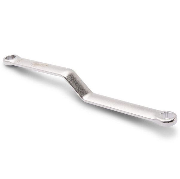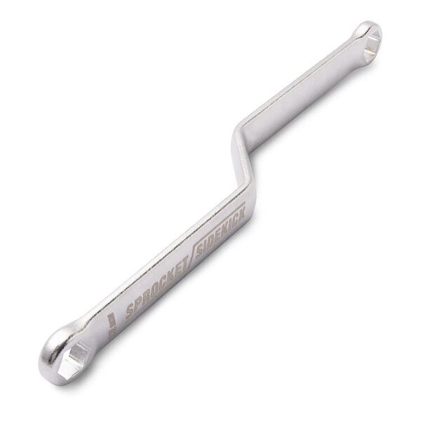 Sprocket Sidekick - 12/13 mm is a specialised dual-size box wrench designed for working on rear sprocket nuts, particularly suited for many dirt bikes. This tool is constructed from forged steel with a satin chrome finish for high durability and strength, featuring an offset design that offers added clearance and improved hand protection during use.