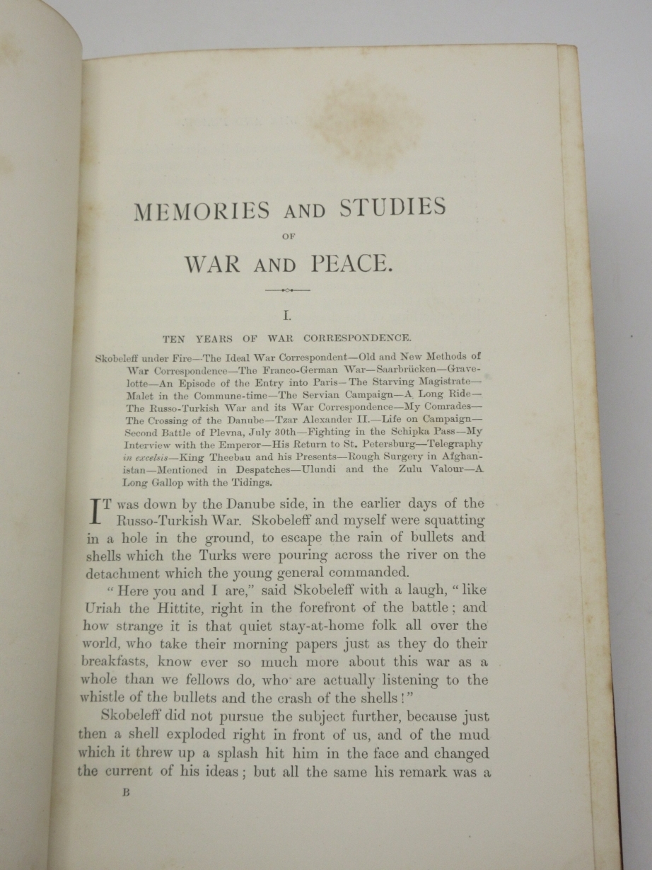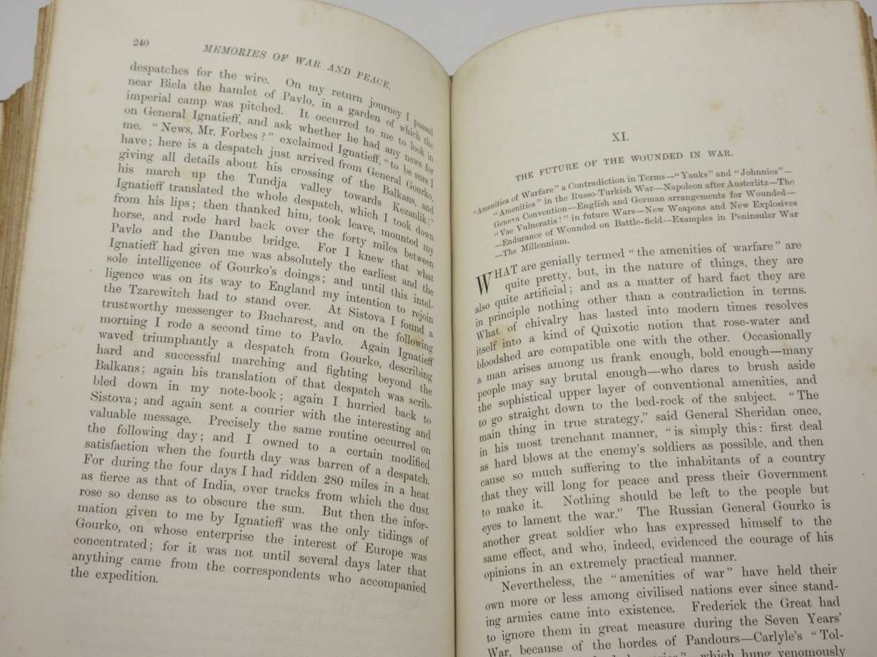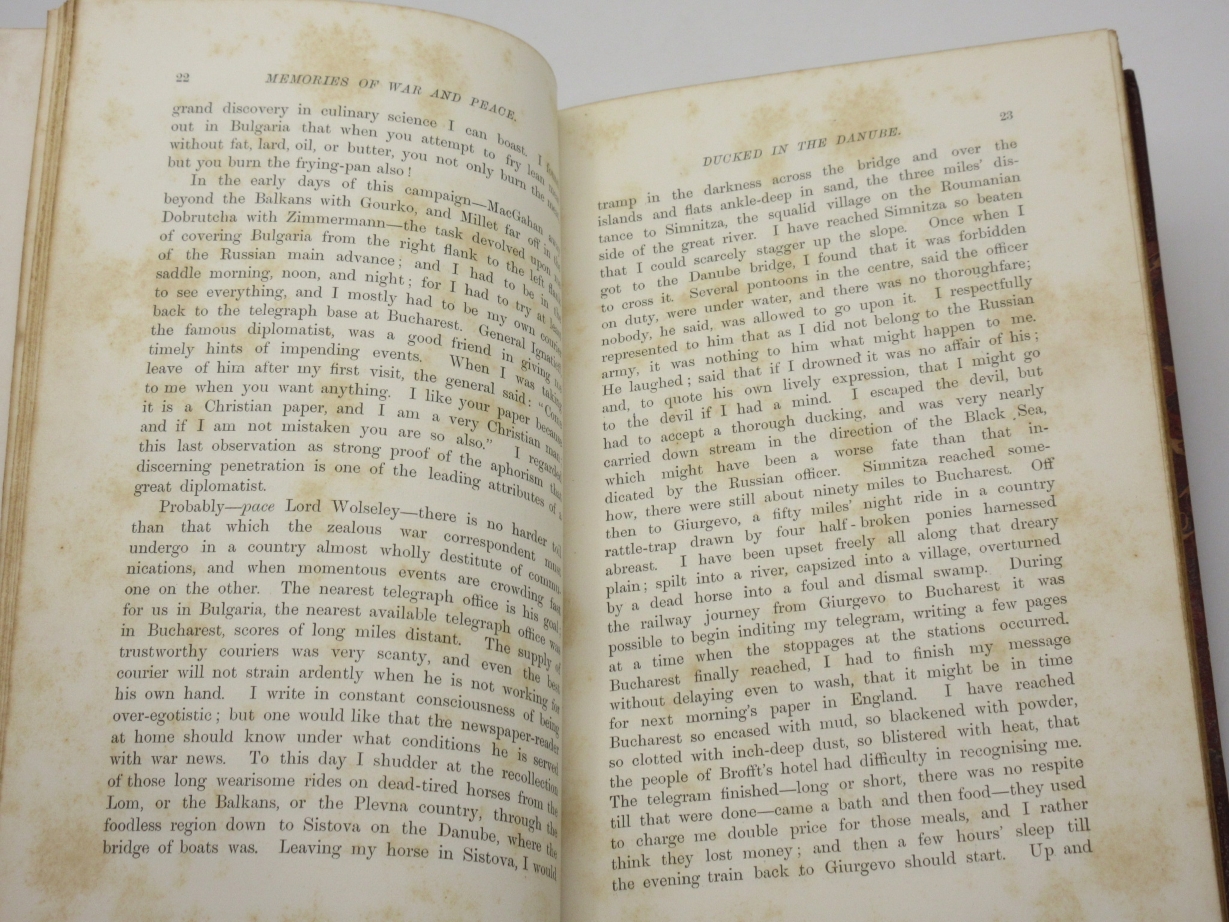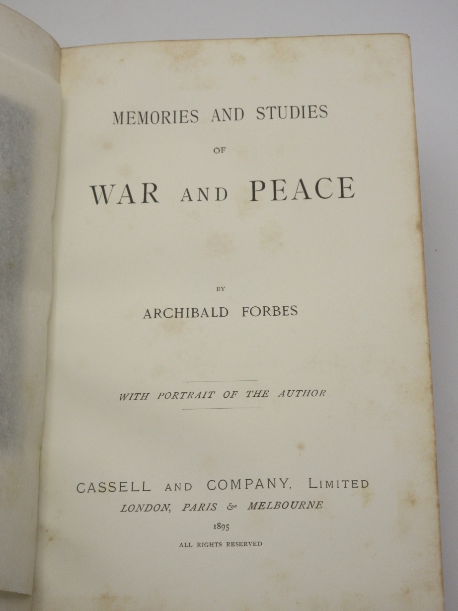 Memories and Studies of War and Peace By Archibald Forbes London: Approx Size: 5.75 x 8.75 inches (15 x 22.5 cms) Hardback. 8vo. [6], 368 printed pages Fine half maroon leather binding by Mudie. Marbled boards, top page edge gilt, other edges untrimmed. Marbled endpapers. Spine with five raised bands. Bump to upper corner of front board. Good solid binding with no cracking to joints. Browning to page edges. Foxing throughout the text. Previous owner's bookplate to front pastedown endpaper. Gift inscription to leading blank, dated 1900. Reminiscences of a war correspondent who covered the 1870 Franco-Prussian War and the 1877 Russo-Turkish War. Overall Condition is Good + There are many more rare and collectable books in our eBay shop, all at very reasonable prices Why not take a look... HERE Keyword SearchTerms: War Correspondent, Franco-Prussian War, Russo-Turkish War, Battle of Sedan |