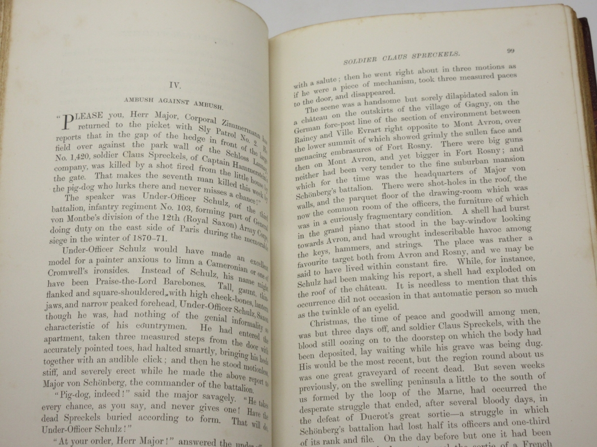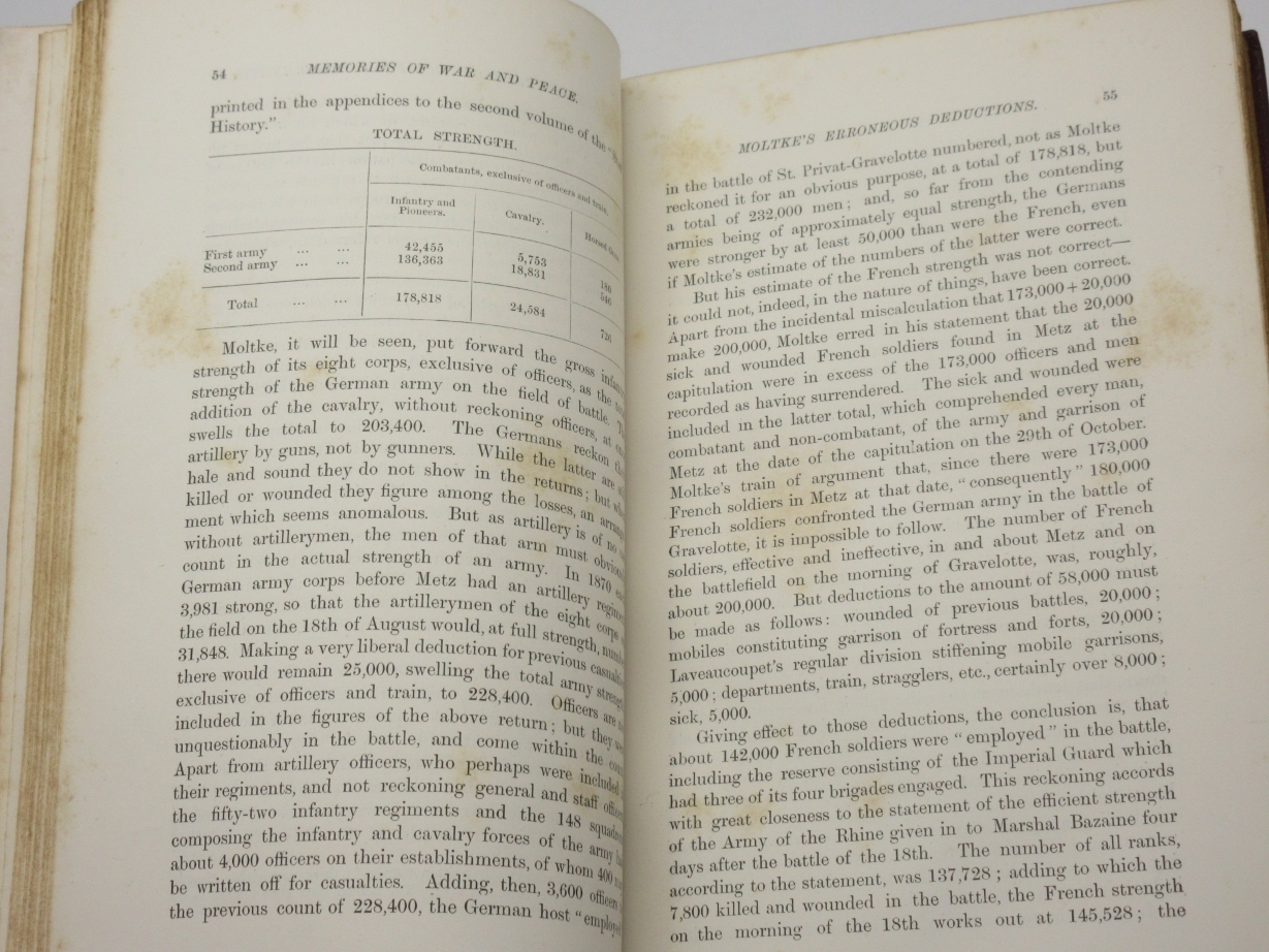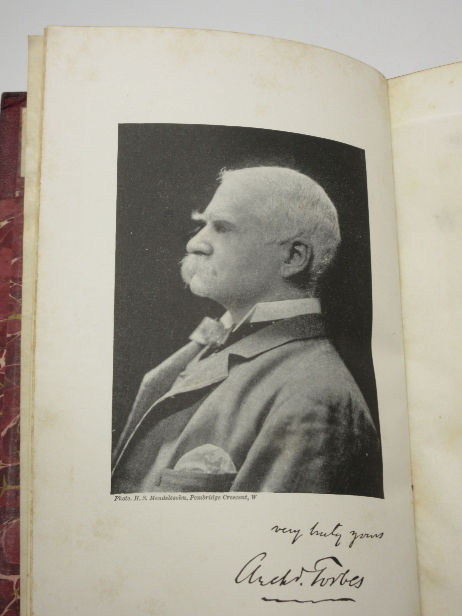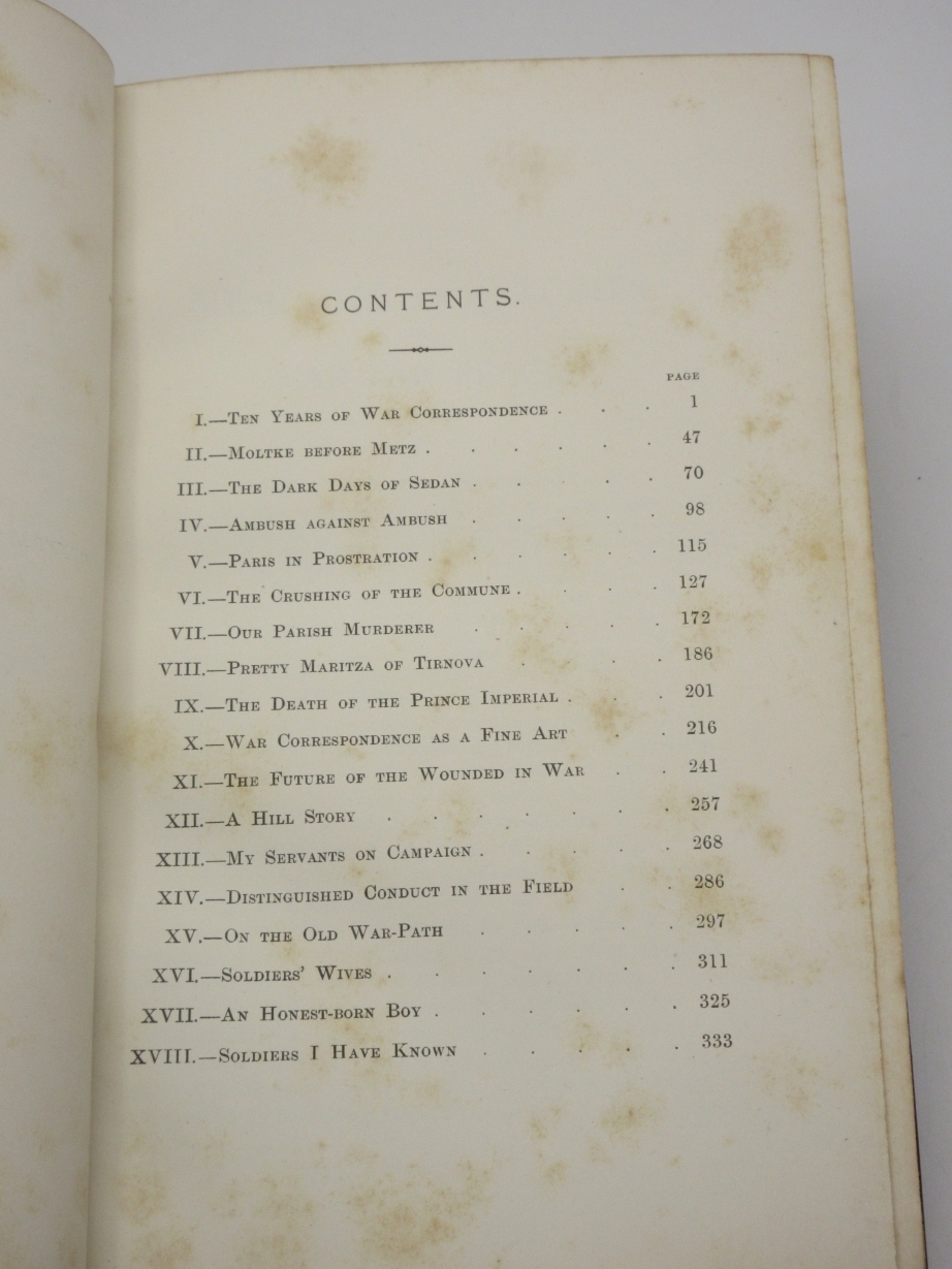 Memories and Studies of War and Peace By Archibald Forbes London: Approx Size: 5.75 x 8.75 inches (15 x 22.5 cms) Hardback. 8vo. [6], 368 printed pages Fine half maroon leather binding by Mudie. Marbled boards, top page edge gilt, other edges untrimmed. Marbled endpapers. Spine with five raised bands. Bump to upper corner of front board. Good solid binding with no cracking to joints. Browning to page edges. Foxing throughout the text. Previous owner's bookplate to front pastedown endpaper. Gift inscription to leading blank, dated 1900. Reminiscences of a war correspondent who covered the 1870 Franco-Prussian War and the 1877 Russo-Turkish War. Overall Condition is Good + There are many more rare and collectable books in our eBay shop, all at very reasonable prices Why not take a look... HERE Keyword SearchTerms: War Correspondent, Franco-Prussian War, Russo-Turkish War, Battle of Sedan |