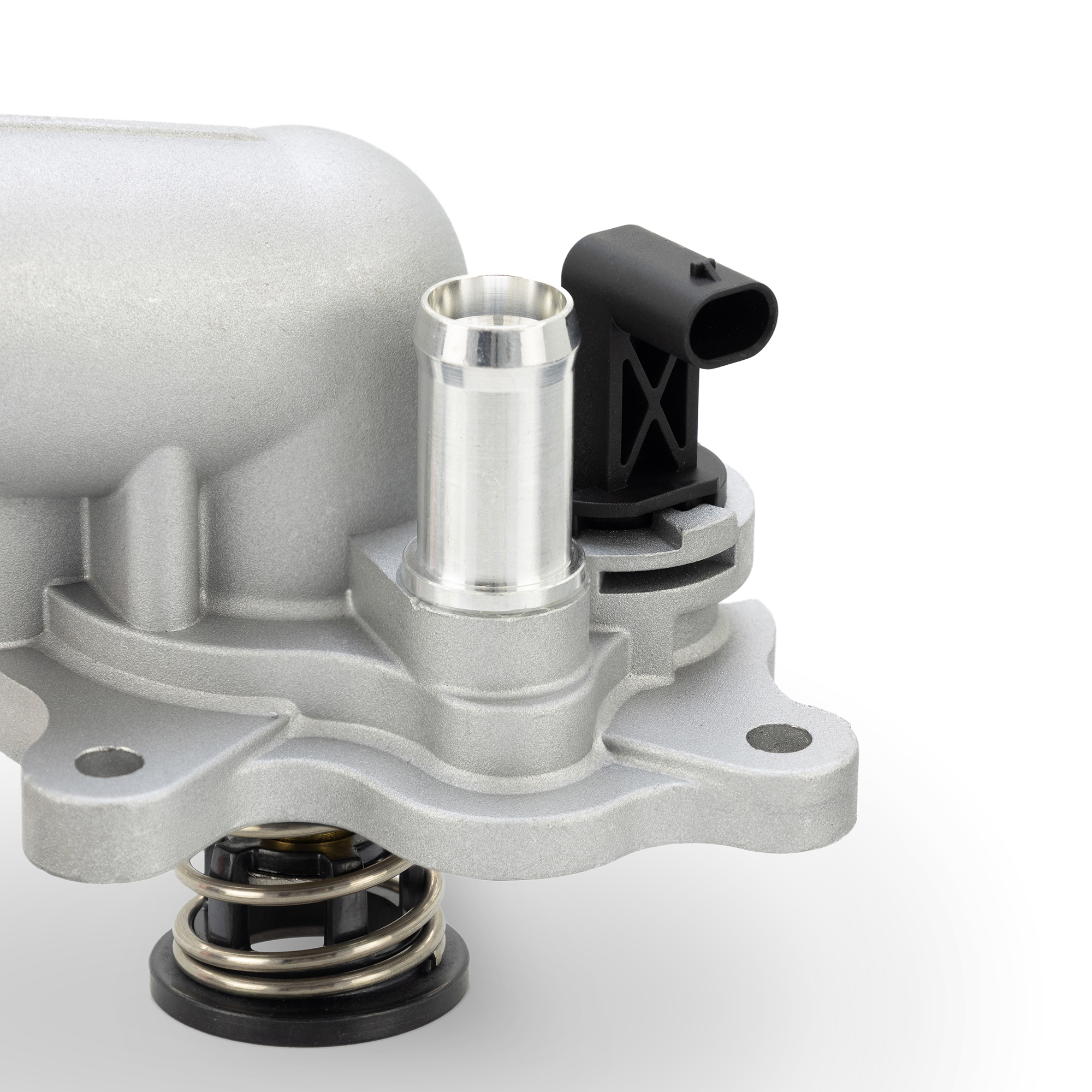 Don’t let a weak thermostat housing bring your adventure to a halt. The Mishimoto Thermostat with Housing for the 2018+ Jeep and Ram 3.6L Pentastar replaces the fragile factory plastic housing with a durable cast aluminum unit, eliminating a common source of leaks and overheating.--This thermostat is calibrated to match factory specifications, opening at 195°F to ensure your engine runs at the correct operating temperature. By maintaining OEM temperature control, it delivers reliable cooling performance without compromising drivability, fuel economy, or emissions. Whether you’re daily driving, towing, or exploring trails, this thermostat keeps your Pentastar-powered vehicle performing exactly as intended.--Engineered with premium wax for precise and consistent operation, the Mishimoto thermostat is built for long-lasting dependability. Like all Mishimoto products, it is backed by our Mishimoto Lifetime Warranty for total peace of mind.