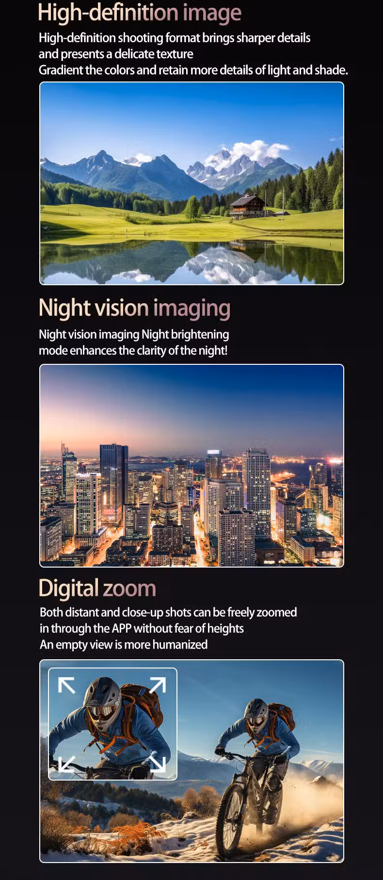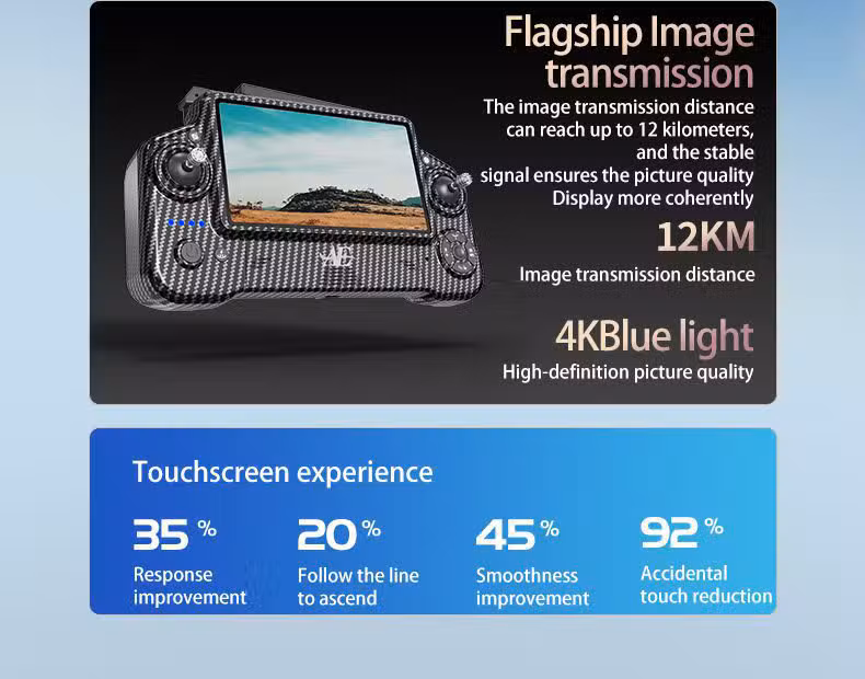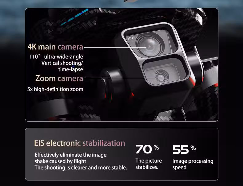 Product Feature: 1. Professional mode: Adjustment of aerial photography parameters in the flight control app (exposure, contrast, saturation, sharpness, white balance, sensitivity) 2. GPS intelligent following; 3. Multi-point route planning flight: The aircraft flies autonomously according to the pre-set route, allowing players to focus on shooting while touching the screen system; 4. Fixed-point orbiting: Identify the center point of the orbit, and then use the joystick to move to the desired orbit radius; 5. Searching for the aircraft: Click the GPS signal icon three times in succession to open the map interface. The map displays the last distance and latitude-longitude position of the aircraft; 6. Sharing pictures with optional music and videos: You can select one or multiple photos to share, but only one video can be shared at a time; 7. 4K adjustable camera (three-axis mechanical stabilization gimbal + electronic stabilization anti-shake + laser obstacle avoidance); 8. 11.4V plug-in smart lithium battery. 9. Airdrop function: Place the airdrop items before takeoff, and press the airdrop button after flying to the drop-off location; 10. GPS one-click return to takeoff point, low battery return, and no signal return.