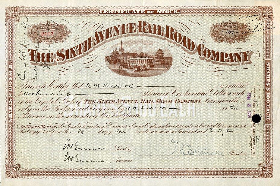 1922 The Sixth Avenue RR Stock Certificate. Attractive New York City streetcar scripophily certificate with vignette of horse trolley passing a church. VF+ condition.