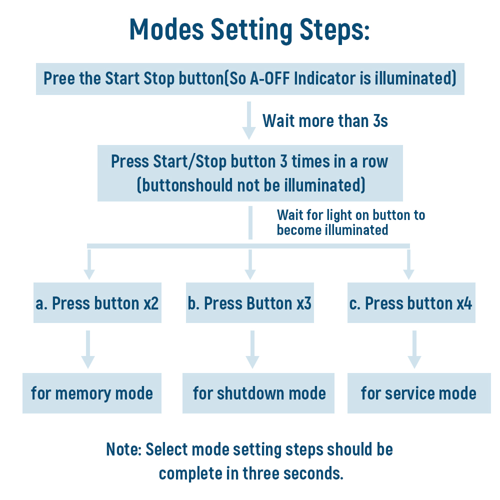 3. Unmittelbar nachdem der Start-Stopp-Schalter automatisch geschlossen wurde, drücken Sie den Start-Stopp-Schalter dreimal (oder zwei- oder viermal) hintereinander und warten Sie dann, bis sich die Anzeige umkehrt. Danach wird der automatische Abschaltmodus (oder der Speichermodus, der ursprüngliche Werksmodus) aktiviert.