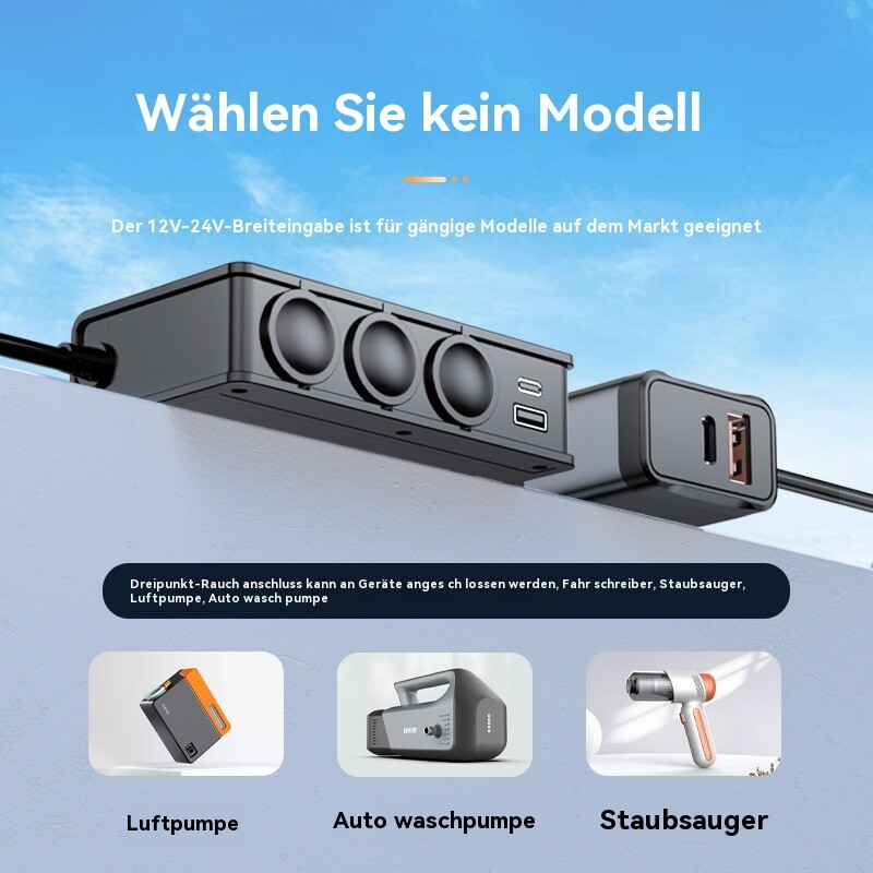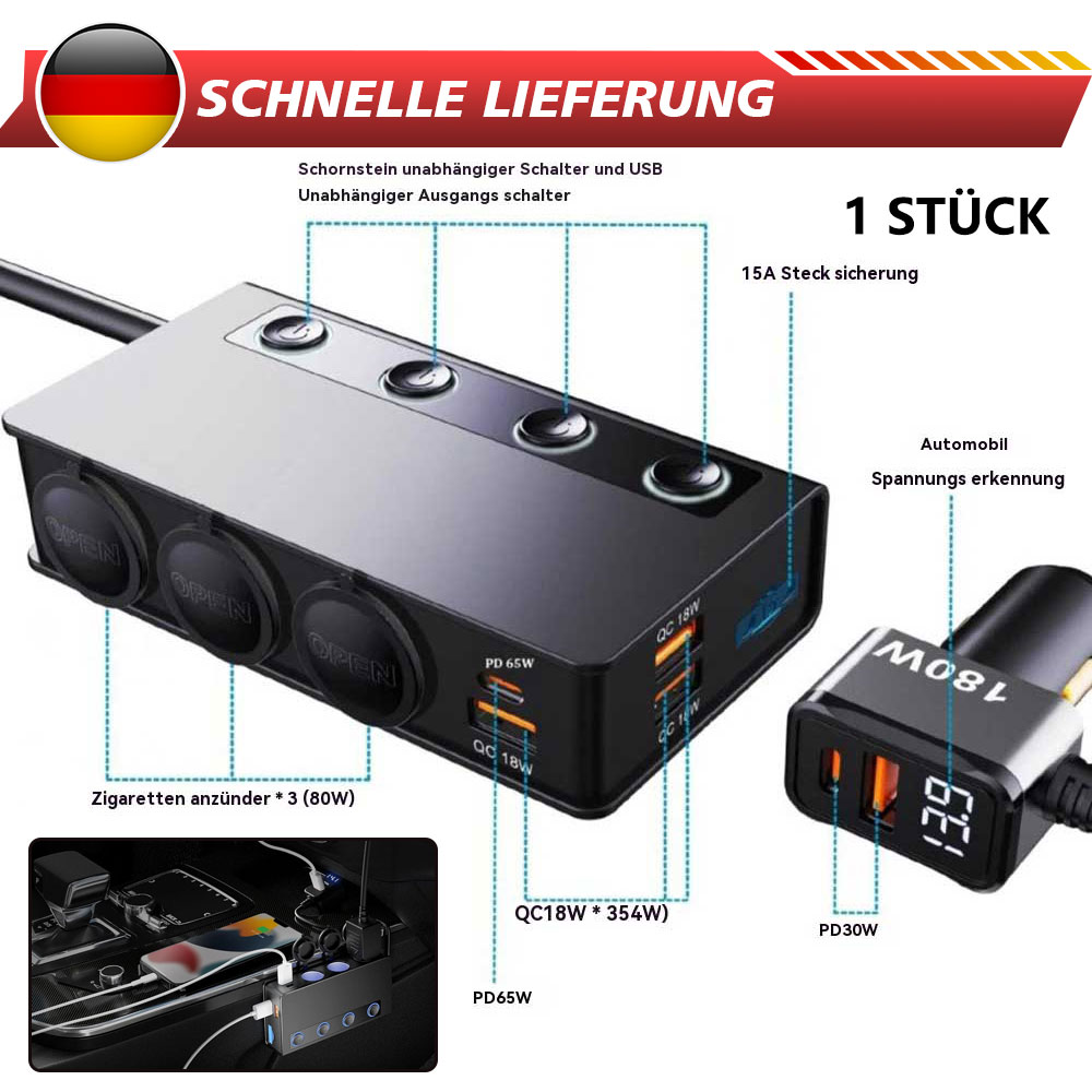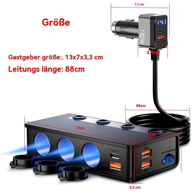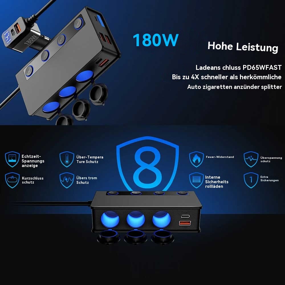 Mit unserem Zigarettenanzünder-Splitter können Sie Ihren Zigarettenanzünder im Auto von 1 auf 3 Steckdosen erweitern, mit einer Gesamtleistung von bis zu 180W. Laden Sie bis zu 9 Geräte gleichzeitig auf, darunter leistungsstarke Kfz-Geräte wie GPS, Dash Cam, Staubsauger, Autokühlschrank, Sitzheizung und SatNav.
