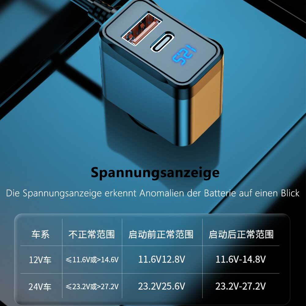 Der eine Schalter am Zigarettenanzünder für 3 USB & 1 USB-C(PD36W~12V/65W~24V), 4 unabhängige Ein/Aus-Schalter für jede Zigarettenbuchse ermöglichen es Ihnen, das Gerät ein- oder auszuschalten, ohne andere Ladegeräte zu beeinträchtigen. Das helle LED-Voltmeter überwacht die Spannung der Autobatterie in Echtzeit.