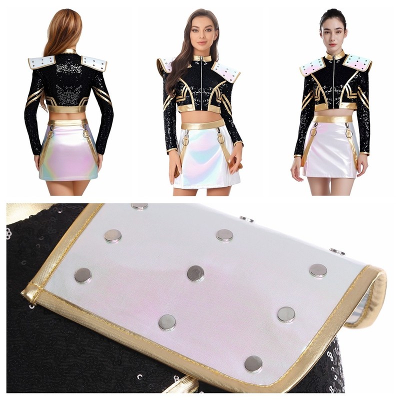 Women Halloween Cosplay Party Outfit Top Metallic Shiny Mini Skirt Stage CostumeUSD 12.99