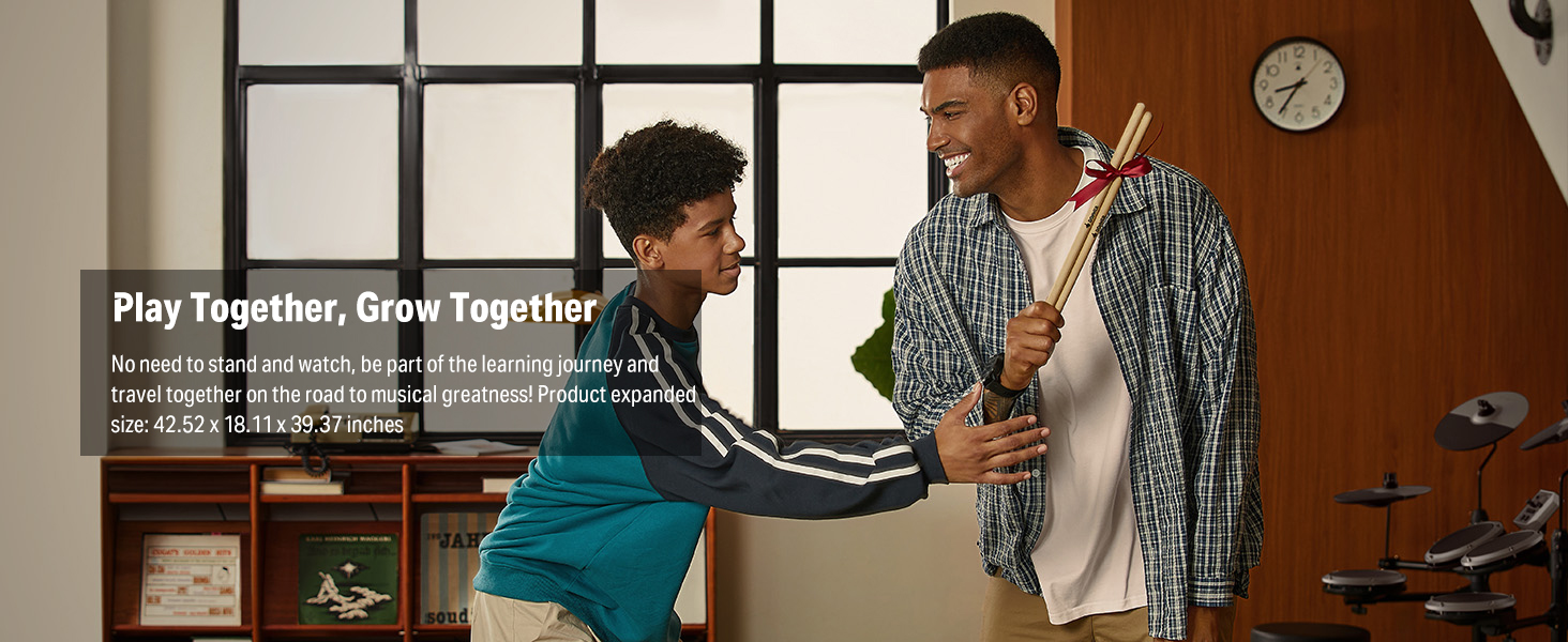【 Powerful Educational Function】This beginner drum kit is loaded with powerful educational features, including a drum coach, 30 accompaniment tracks, and fun exercises that help beginners improve their playing skills and enjoy every note!
