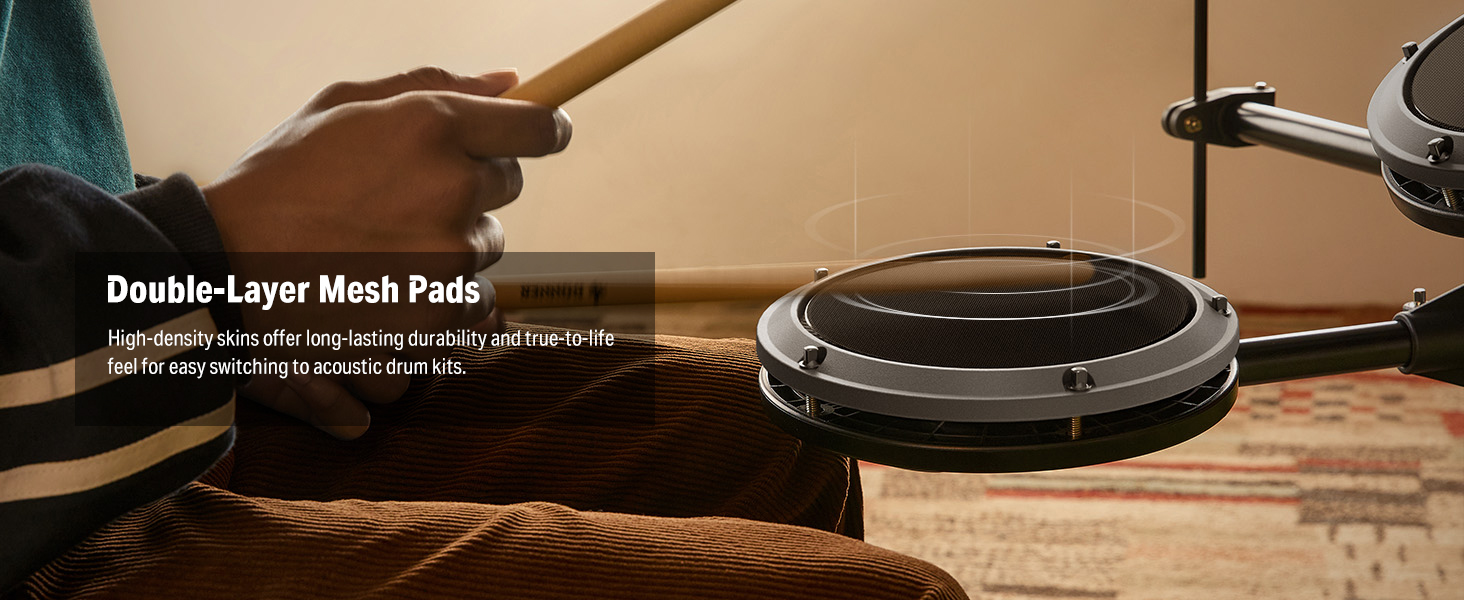 【 Industry Standard Mesh Heads 】The DED-80 electric drum set comes with double-layered, high-density mesh drumheads that provide a durable and realistic playing experience.