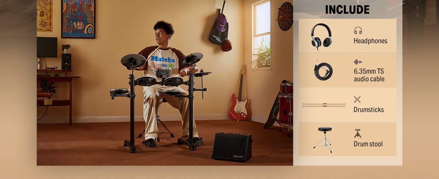 【 The total Electric Drum Set】The Donner DED-80 drum set features a double-layered mesh high-density structure for a realistic drumming experience. It comes with 4x 6" mesh drum pads, 3x 10" cymbals with a full strike zone, a sturdy metal frame, drum module, drum throne, drumsticks, headphones, and all cables needed. The Donner electric drum kit can help you practice to become an excellent drummer.