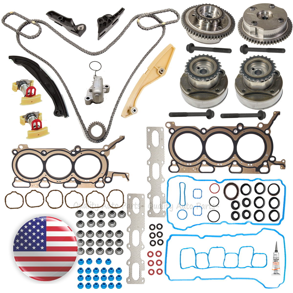 1 Primary Timing Chain (254 Link - Silent Type)2 Secondary Timing Chain (50 Link - Roller Type)1 Crankshaft Gear (29 Teeth)1 Timing Guide (Lower, Left)1 Timing Guide (Lower, Right)1 Timing Guide (Upper)1 Timing Guide (Lower1 Primary Timing Chain Tensioner2 Secondary Timing Chain Tensioner2 Timing Chain Tensioner Arm2 Cam Gears / VVT Cam Sprocket Exhaust