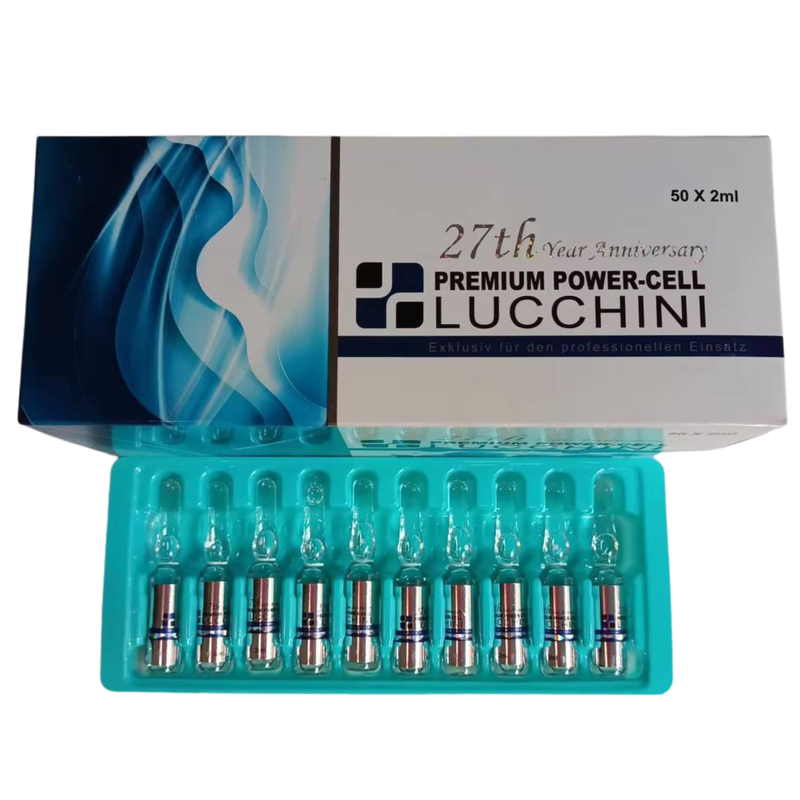 Lucchini Premium Power-Cell is a high-grade anti-aging and skin rejuvenation formula developed in Switzerland. This special 27th Anniversary Edition features bio-active peptides, placenta extract, amino acids, and multivitamins designed to restore youthful radiance and improve skin tone at the cellular level.