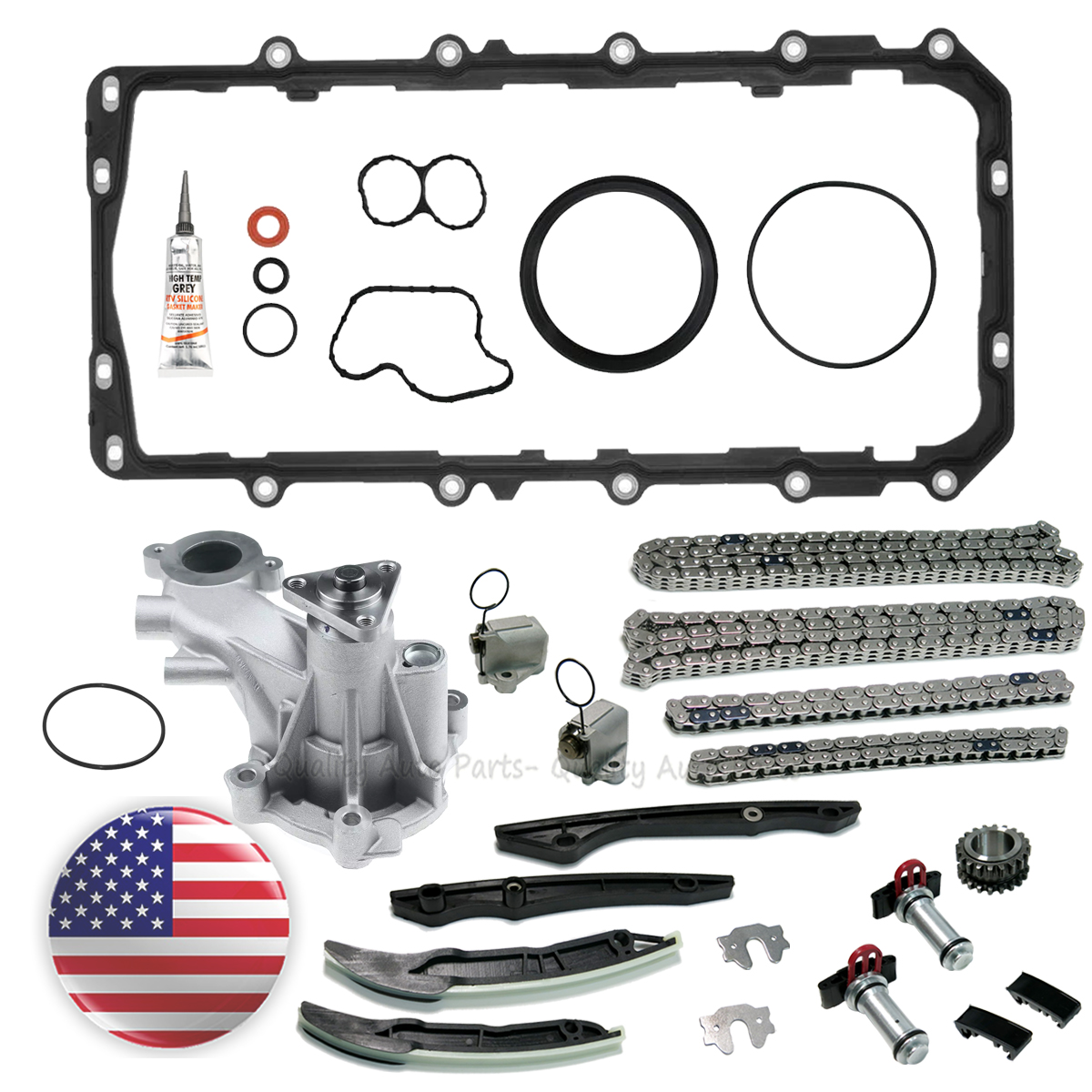 2 Timing Chains (Primary - Lower)2 Timing Chains (Secondary - Upper)2 Timing Chain Tensioners (Lower)2 Timing Chain Tensioners Arms4 Chain Guide Rails1 Crank Gear (Double Row)1 Water Pump With a Oil Seal1 Conversion / Lower Gasket Set