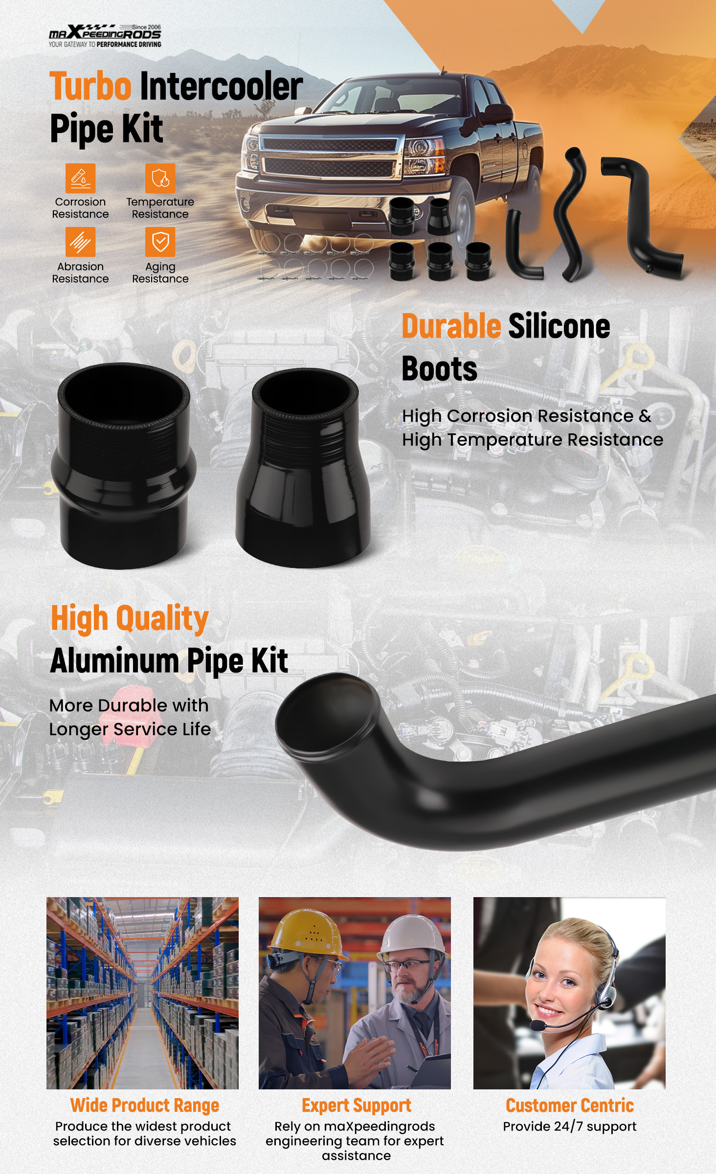 2.Includes high-temp couplings and high quality stainless steel T-bolt clamps