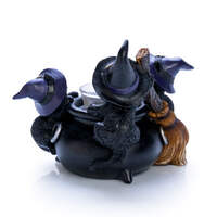 Mystical tealight holder featuring three black cats playing on a cauldron. Detailed sculpting and dynamic design make this burner a captivating functional ornament. Broomstick and pentacle triple moon icon add a magical touch. Mystical tealight holder featuring three black cats playing on a cauldron Detailed sculpting and dynamic design make this burner a captivating functional ornament Broomstick and pentacle triple moon icon add a magical touch