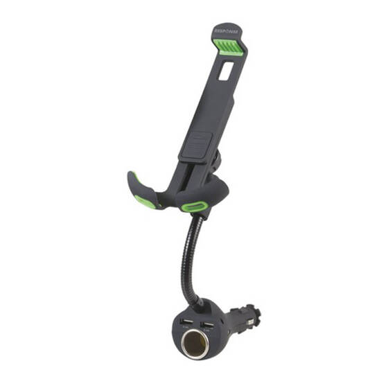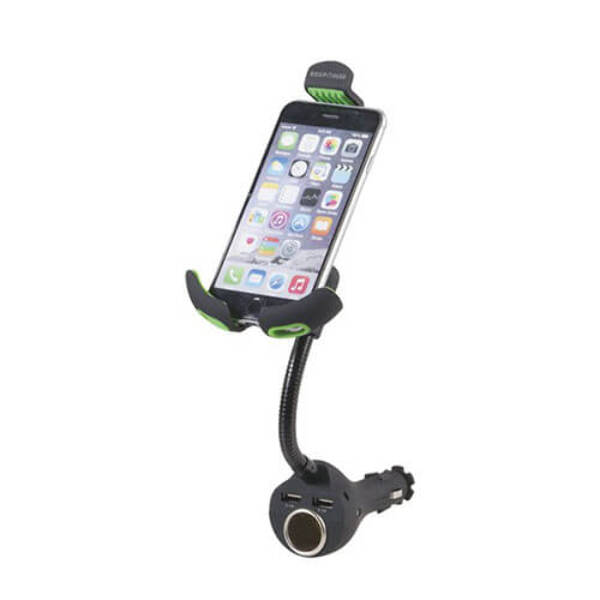 This is genius! It plugs straight into your cigarette lighter socket to provide a phone holder, as well as two high-power USB charging outlets (up to 4.8A combined)! What's more is it doesn't even use up the cigarette lighter socket, providing you with another one too! The flexible gooseneck allows you to position the phone conveniently, and adjusts to firmly hold just about any phone size. It works with 12 and 24V systems, so suitable for trucks too! It even includes a microUSB charging cable, but you can bring your own for other devices as well.