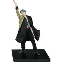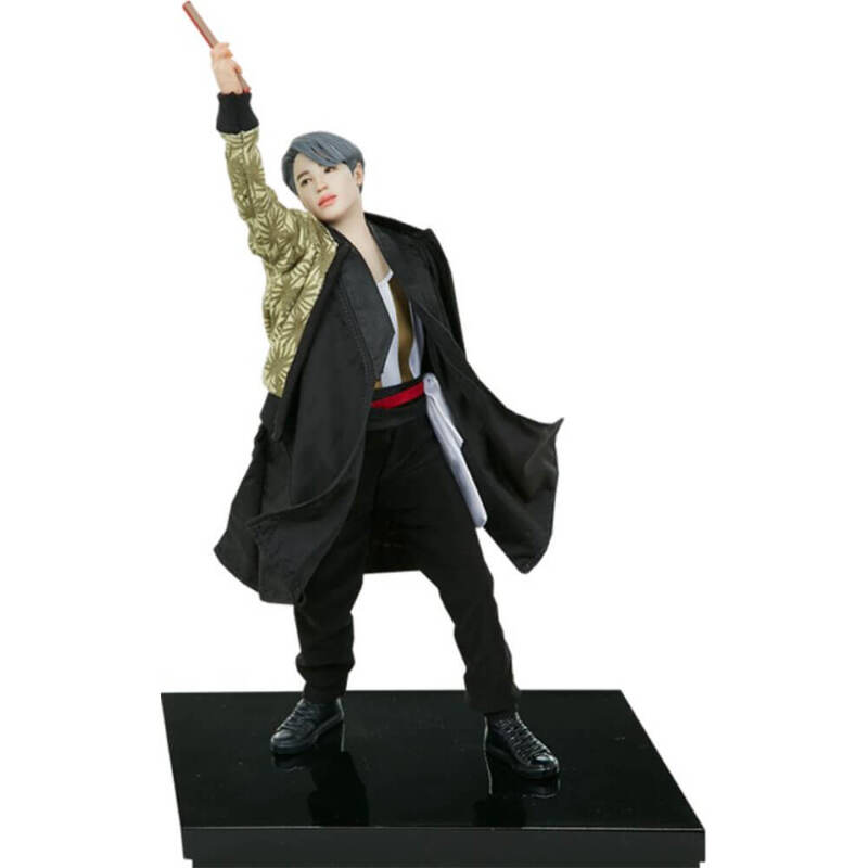 The Jimin Deluxe Statue measures 11.3" tall and 8.4" wide and features an intricate mixed media costume application. The carefully tailored outfit includes wire for posing the robe fabric to capture the dynamic movement of Jimin 's stage presence. Complete with sculpted details like earrings and black shoes, the energetic figure stands on a black stage base to match the other members of the collection.