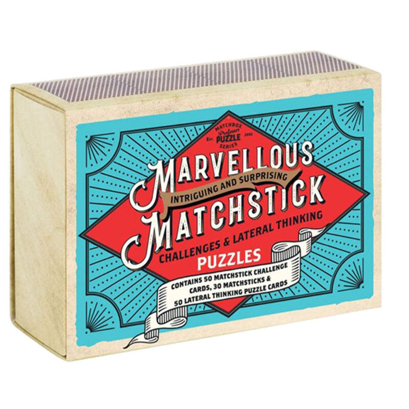 INCLUDES: 50 matchstick challenge cards with answers, 30 wooden matchsticks and 50 lateral thinking puzzle cards.