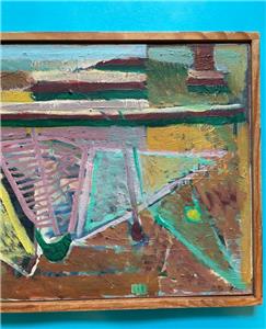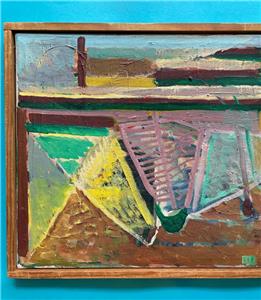 Rare modernist oil by Danish/German artist Elsebet Schütze (1923–2004). This refined abstract composition reflects Schütze’s hallmark: rhythmic geometric forms and vibrant color set against a spacious ground.