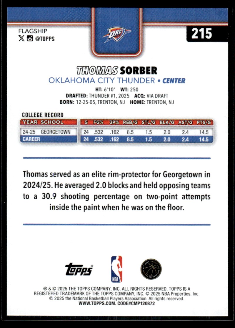| 2025-26 TOPPS THOMAS SORBER RC OKLAHOMA CITY THUNDER #215 |