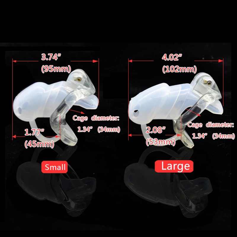 | Material: Cage is made of food-grade silicone. Ring is made of biosourced resin. The whole set comes in an discreet package with 1 cage, 1 ring, 2 magic locks and keys (1 brass lock+1 ABS lock). Measurements: Cage size: small cage :Length of the inside cage is about 1.77''(45mm),diameter of the cage is about 1.34''(34mm). Big cage :Length of the inside cage is about 2.08''(53mm),diameter of the cage is about 1.34''(34mm). One cage comes with only one ring,the ring is fastened on the cage with the pin,you can't disassemble yourself. Manual Measurement:Please stand our measurements errors for 1-3mm Privacy Guaranteed: Your privacy is the utmost importance to us. The default name on the package is " plastic toys "(any other requirements, please send us a message), and with our discreet packaging you can shop in confidence, the only person who knows what's inside the package is you!