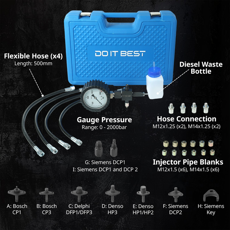 Das Diesel Hochdruckprüfer Common Rail Test Kit ist ein unverzichtbares Werkzeug für Werkstätten und Fahrzeugtechniker, die den Hochdruck-Kraftstoffkreislauf von Common-Rail-Dieselmotoren präzise testen möchten.
