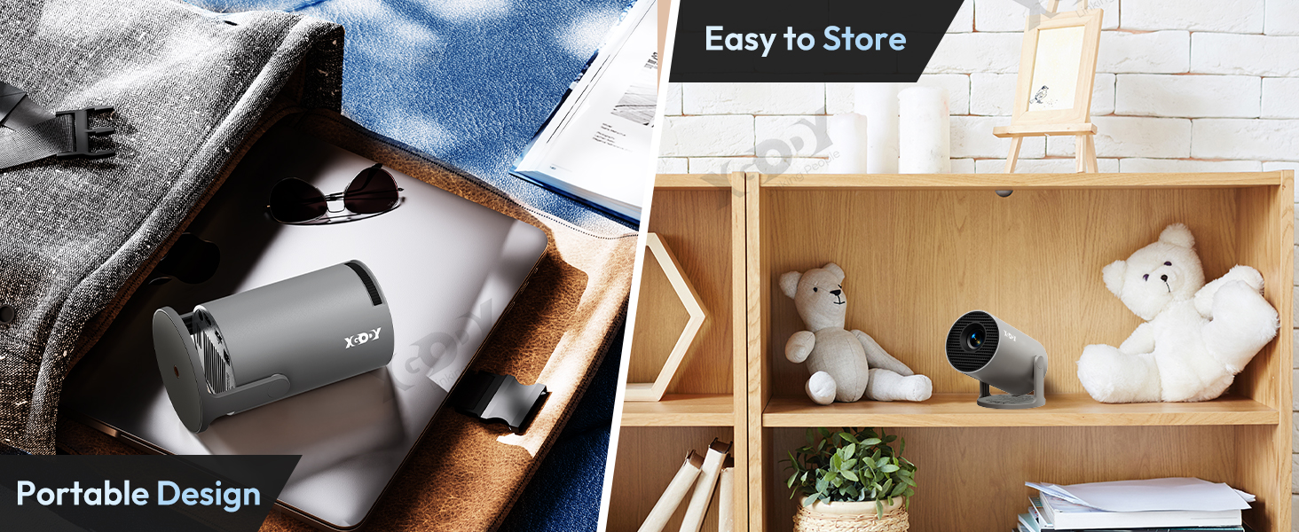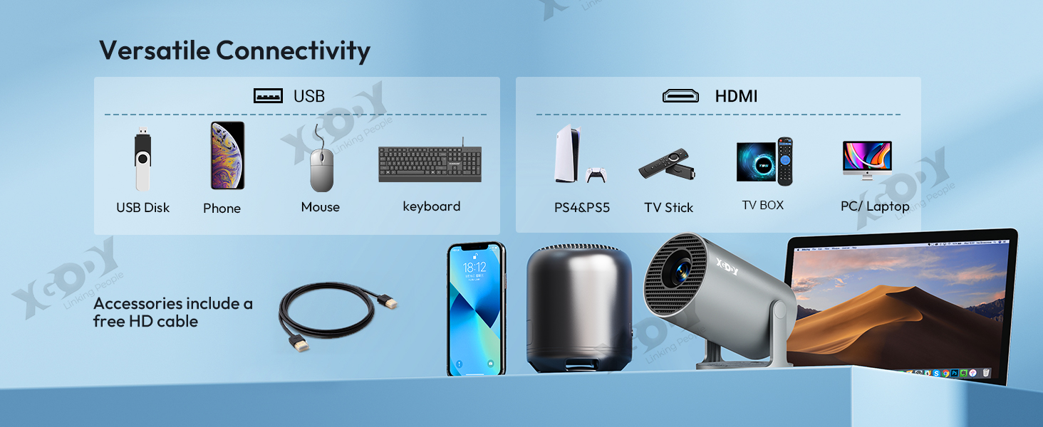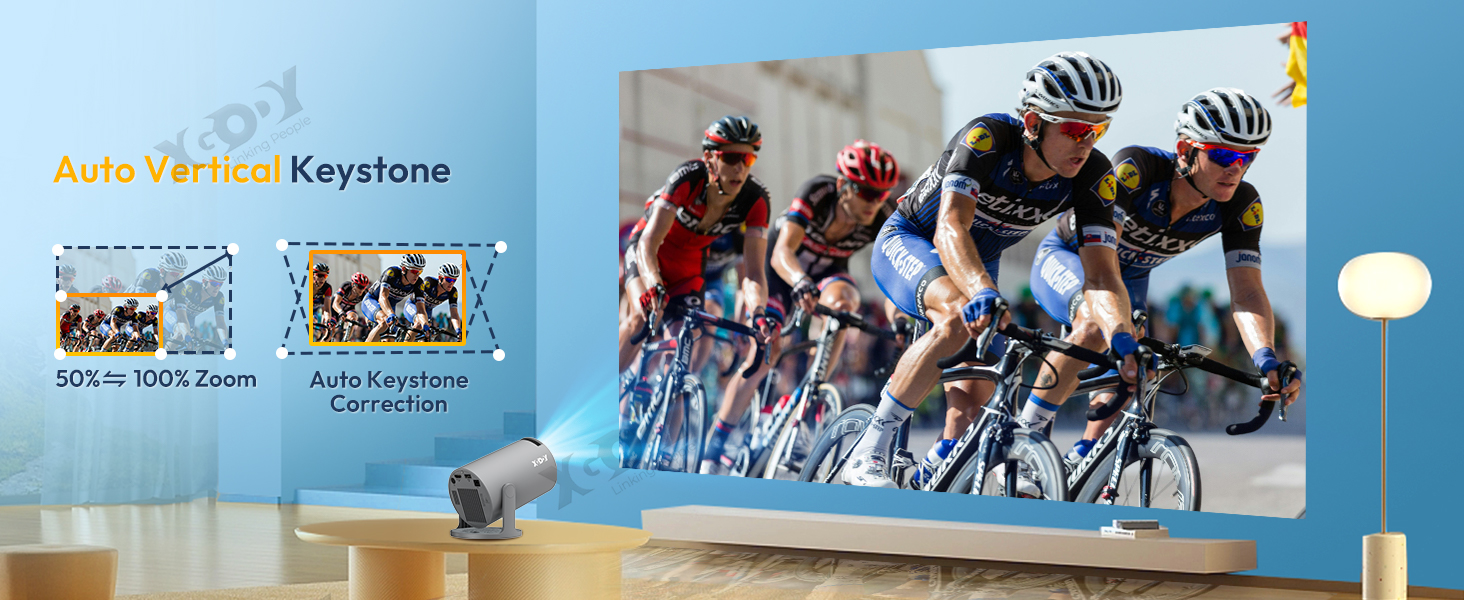 【Auto Vertical Keystone correction and image scaling】The XGODY movie projector allows you to easily adjust the vertical and horizontal image. You can adjust the projected image from 100% to 50% without having to move the projector. No matter how you position it, the mini projector's image is always clear. |