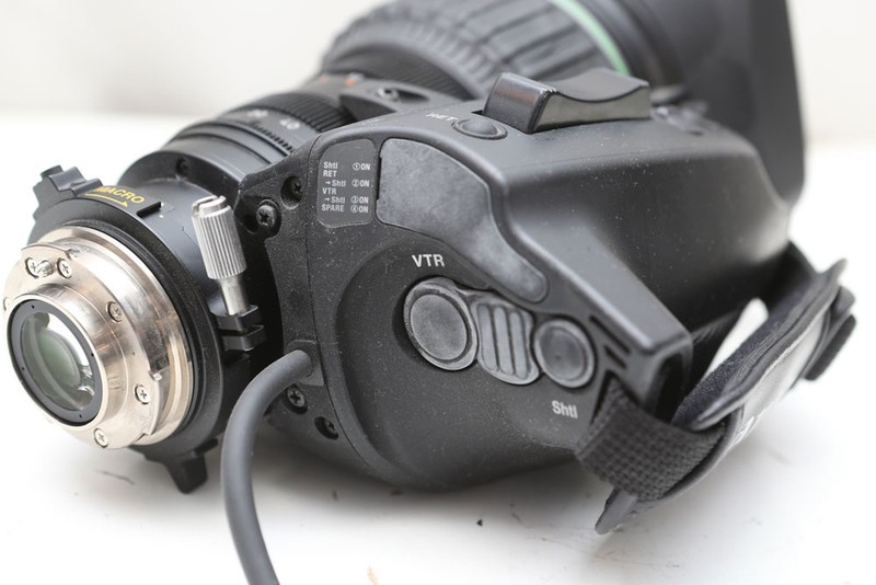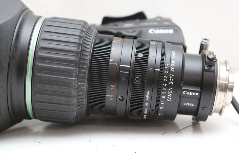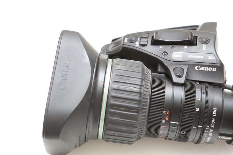 This Canon KT20x5B KRS HD lens is in excellent used condition. It was originally designed for JVC GY-HM700, GY-HM750, GY-HM790, GY-HM850, and GY-HM890 cameras, but it also mounts directly—without any adapters—on Panasonic HPX300, HPX350, AG-HPX370, Sony HVR-Z7U, and HVR-S270U HD cameras.