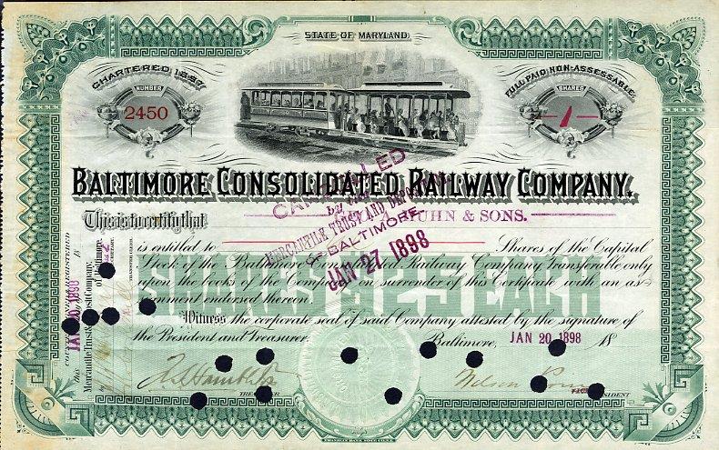 1898 Baltimore Consolidated RW Stock Certificate. Nifty early trolley scripophily certificate with vignette of tandem trolleys, likely depicting the cable car system that operated briefly in Baltimore. VF condition with multiple hole cancellations.