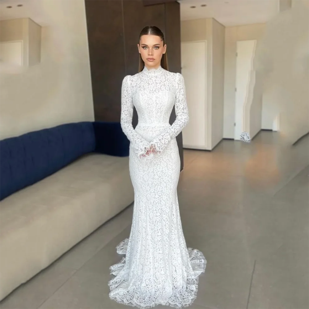 lvory Lace Wedding Dresses High Neck Full Sleeves Sweep Train Bridal Gowns Hot