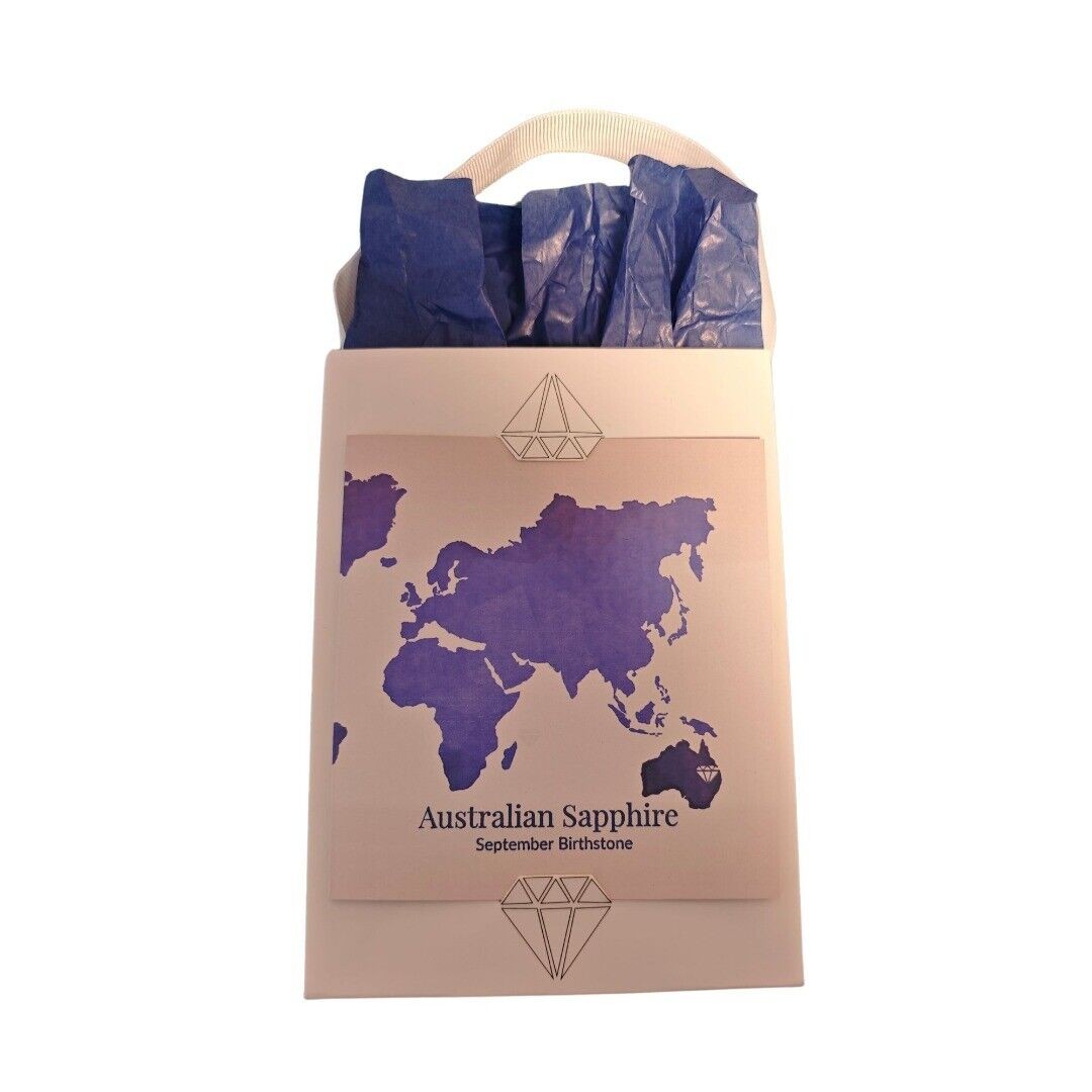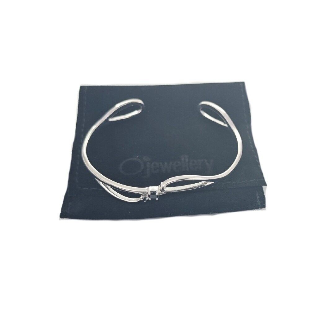 Sterling Silver Statement sapphire Bangle. Trilogy design set with three natural Australian round dark inky blue sapphires Sapphires are associated with purity and wisdom. They are the birthstone for September. Finished with a commercial grade rhodium plate to give a high quality shine finish. Supplied in an Ojewellery gift pouch within a ribbon handled gift bag complete with product information authenticity card with space for a gift message and a jewellery cleaning cloth to keep your jewellery in ready to wear condition. Specification: Bangle Size: 17.5cm Medium but the open design can be shaped to fit a larger or smaller wrist Stone: Natural Inky Blue Sapphire 3 round 1 x 4mm and 2 x 2mm Bangle weight 12.5g Hallmarks on bangle : OJ in a hexagon (makers mark) 925 for sterling silver and an anchor for verified by Birmingham Assay