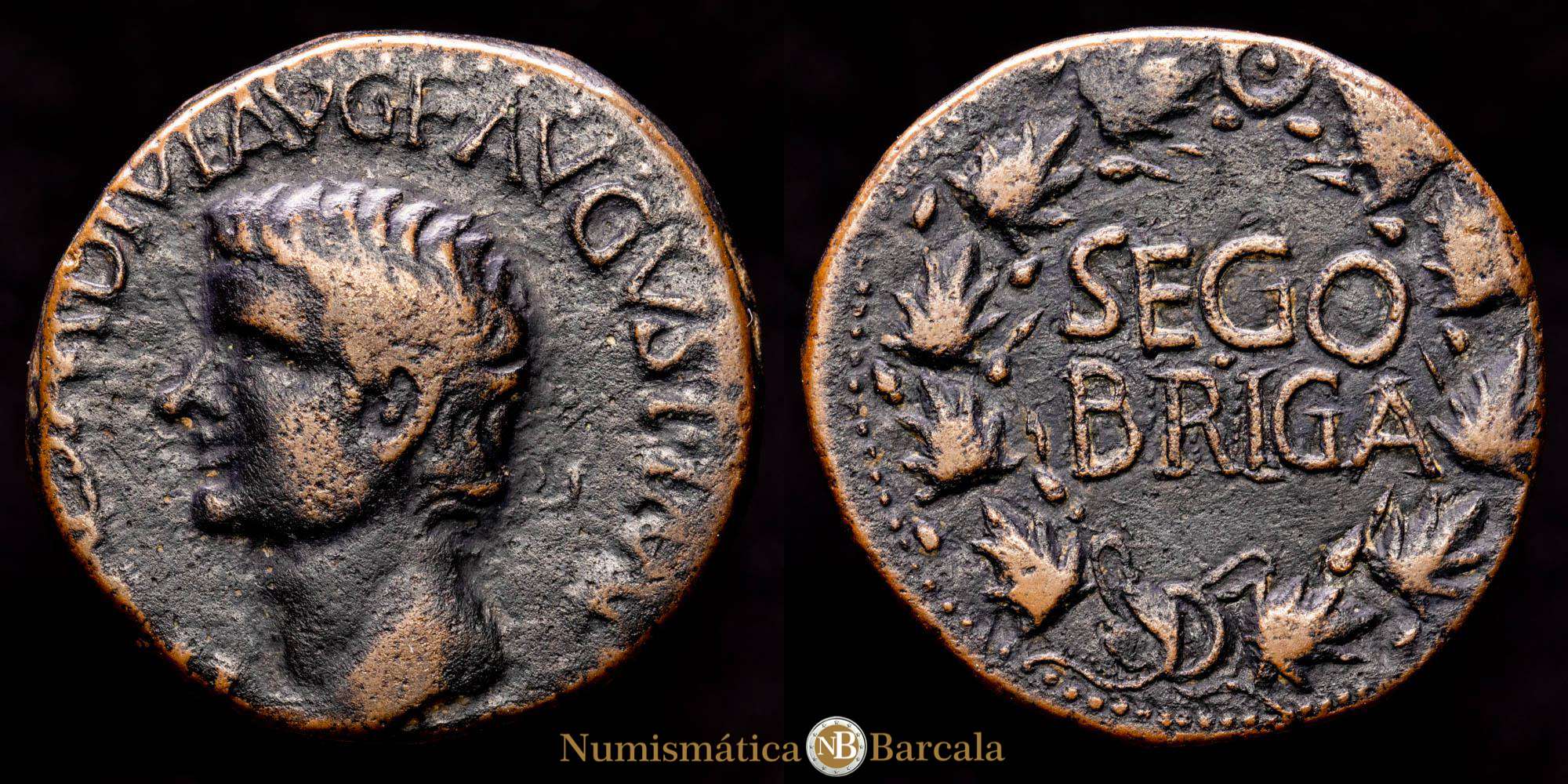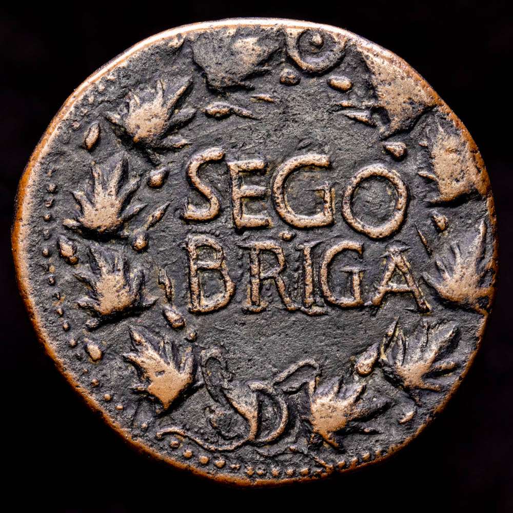 SEGOBRIGA (Saelices, Cuenca). Como. (Ee. 13,11 g/28mm). 14-36 ºC (FAB-2188). Anv: Cabeza de Tiberio a izquierda, alrededor leyenda: TI CAESAR DIVI AVG F AVGVS F IMP VIII. Rev: Leyenda: SEGO/BRIGA, dentro de láurea. MBC+.