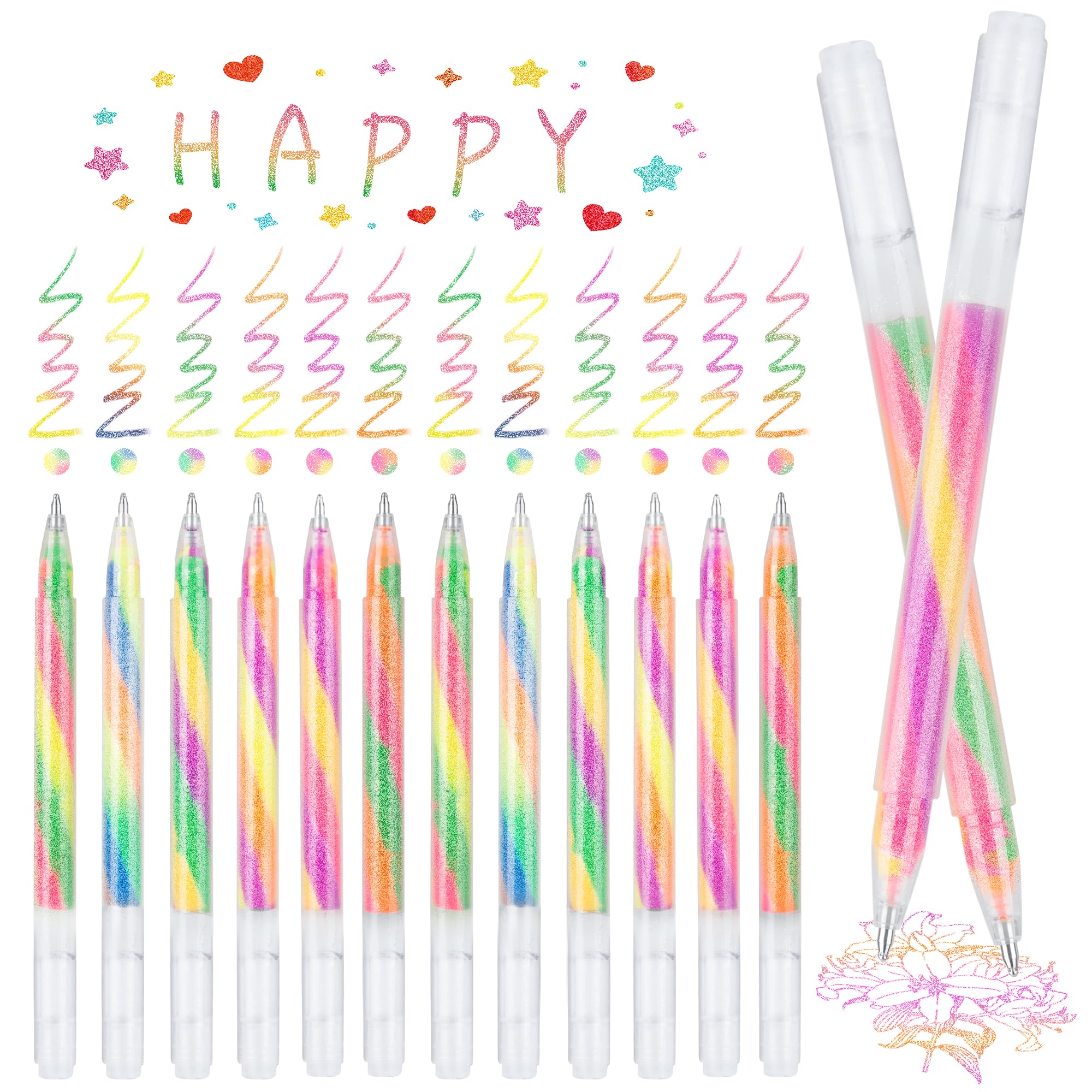 - Magical Rainbow Ink -12 pcs rainbow gel pens, including 12pcs glitter with 6 color combination,with 1.00mm ballpoint tip will change colors while you write or draw! This set of gel pens is 3 Color in 1 Design, and the colors naturally transition to create a beautiful and dreamy effect, providing your artwork with a variety of colors to choose from. So art projects will become a litle more magical!