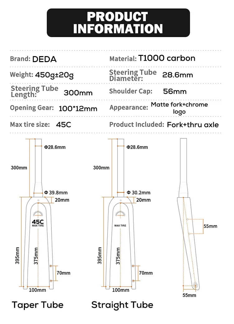 Steerer Tube Size:Taper ,Top 1-1/8" (28.6mm), Down 39.8mm, 300mm Lenght ,