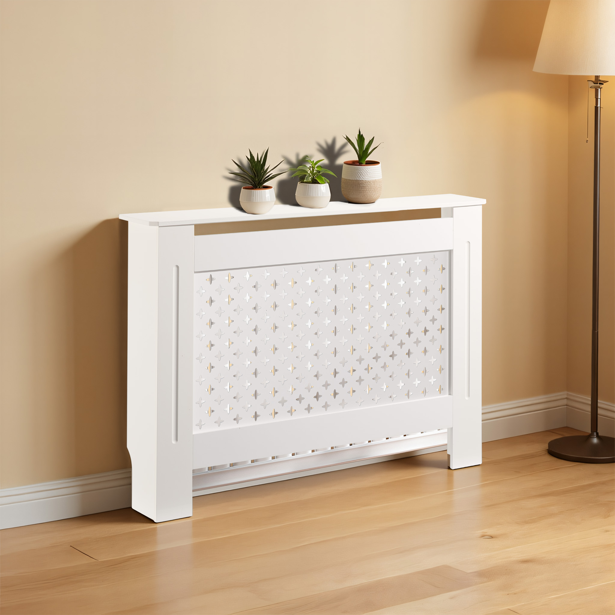 Il rivestimento in legno MDF garantisce stabilità e un aspetto elegante, mantenendo una superficie liscia e uniforme che si integra facilmente con diversi stili di arredamento. La finitura bianca dona luminosità e adattabilità, permettendo al pannello copritermosifone di valorizzare soggiorni, ingressi o camere da letto. La struttura solida assicura una lunga durata e una resa estetica affidabile.