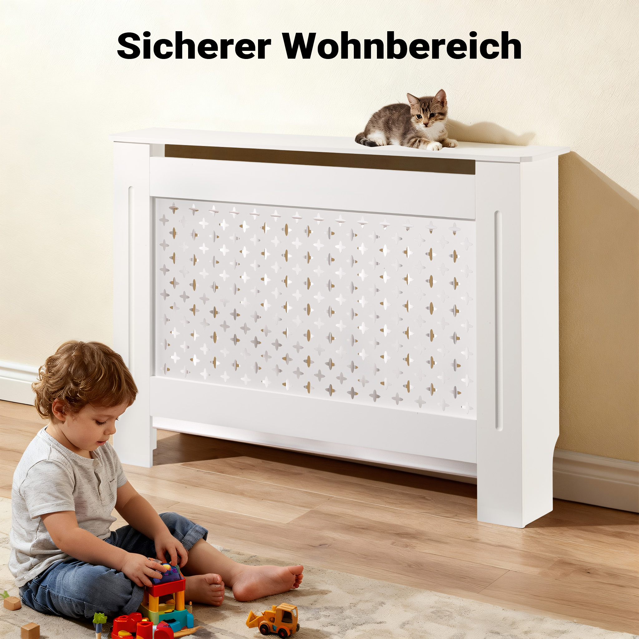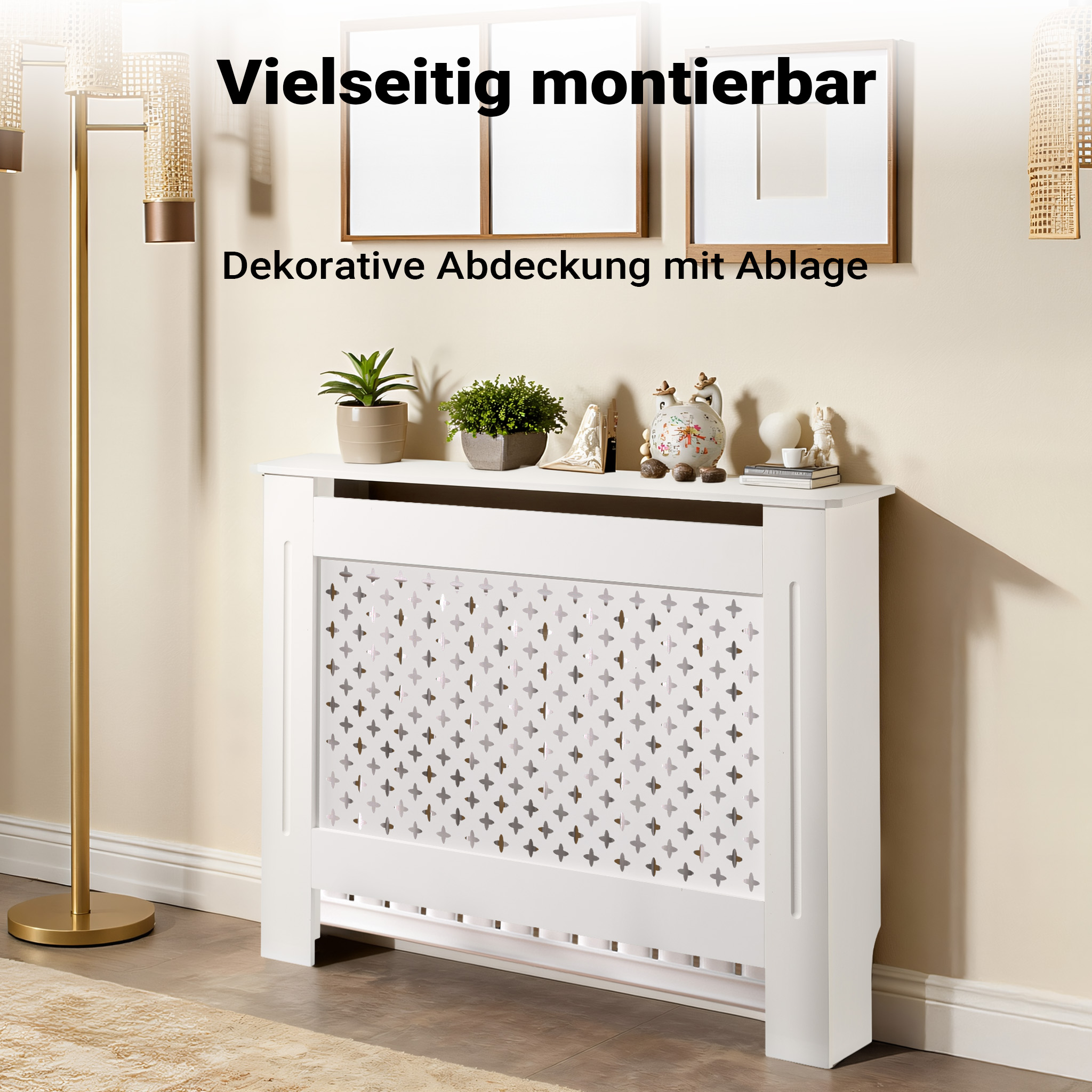 Il pannello copritermosifone offre una soluzione raffinata per nascondere il radiatore e armonizzare l’ambiente domestico. Con il suo design classico bianco e la struttura in MDF di alta qualità, questo copritermosifone moderno unisce estetica e funzionalità. Le dimensioni di 112 x 19 x 82 cm lo rendono ideale per diversi spazi, aggiungendo un tocco decorativo senza compromettere l’efficienza del riscaldamento.