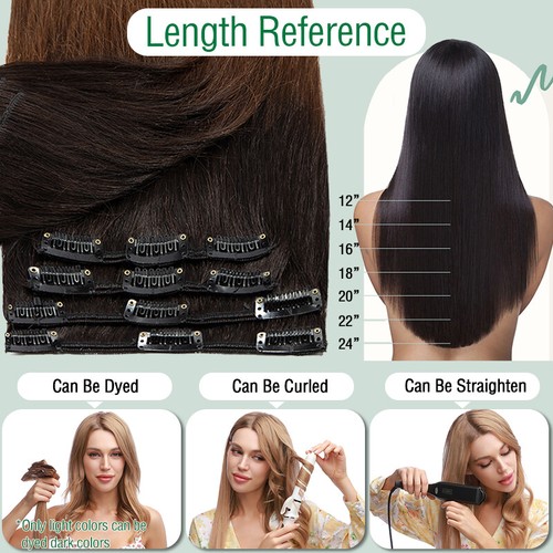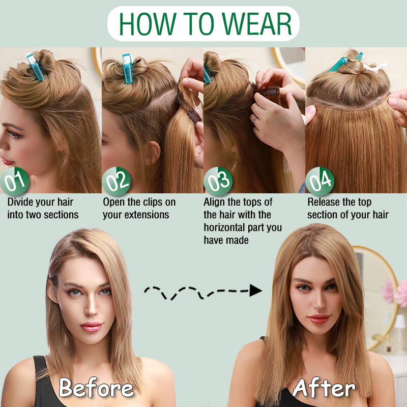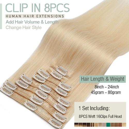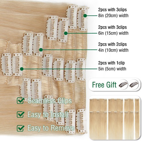 | 8pcs Full Head Set Contains | 2pcs 8’’(20cm wide wefts) - 3clip per weft 2pcs 6"(15cm wide wefts) - 3clip per weft 2pcs 4"(10cm wide wefts) - 2clip per weft 2pcs 2"(5cm wide wefts) - 1clip per weft |