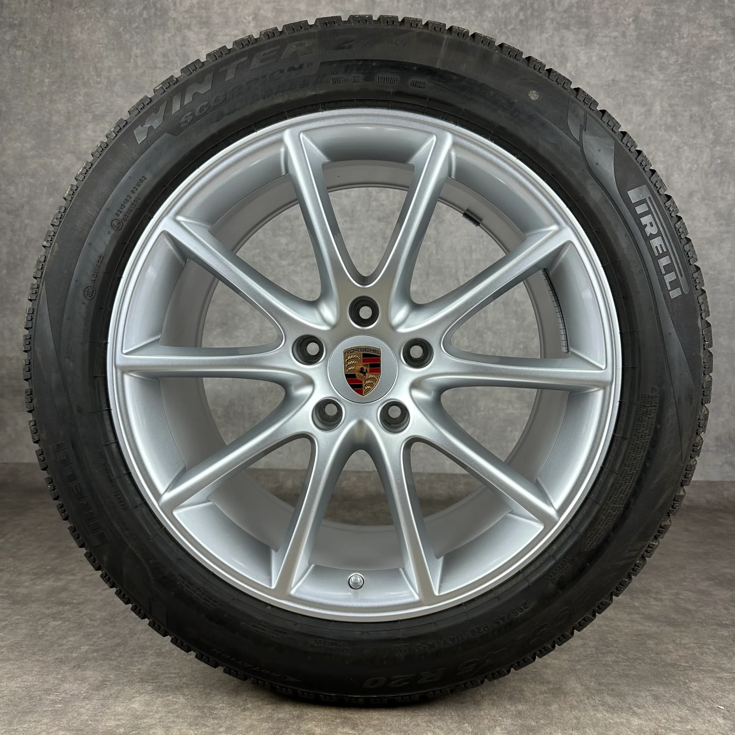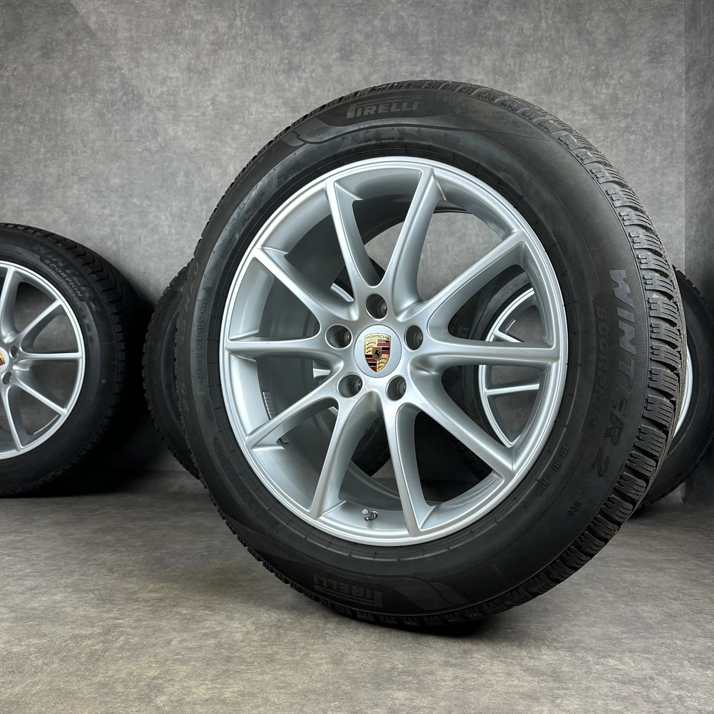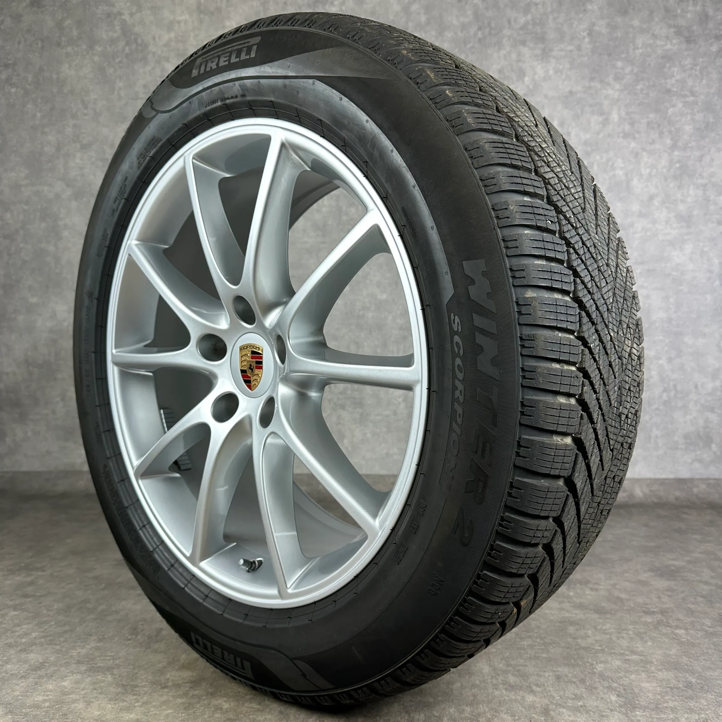 Angeboten werden 4x Original PORSCHE Cayenne Coupé (E3 II) Cayenne Design Winter-Kompletträder in silber.