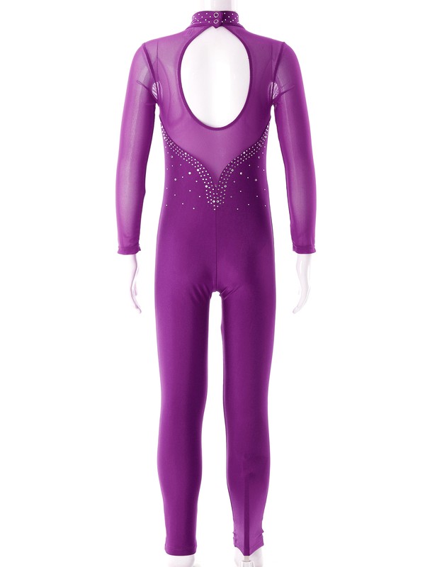 Long sleeve, mock neckline with press buttons, jumpsuit is decorated with shiny rhinestones, hollow back.